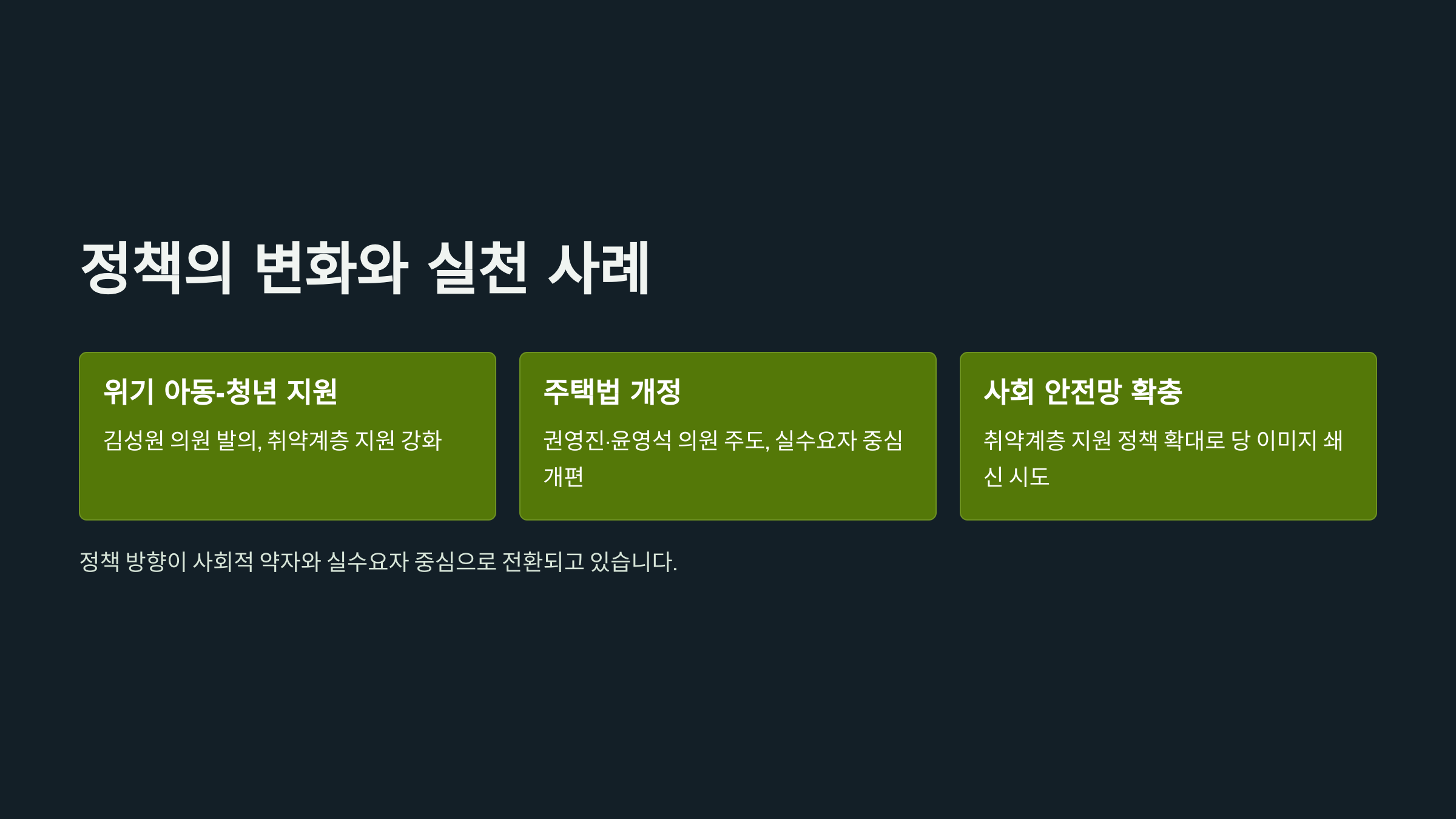3. 국민의힘 내의 변화는 주요 법안 발의와 같은 정책적 대응을 통해 발현되고 있습니다.