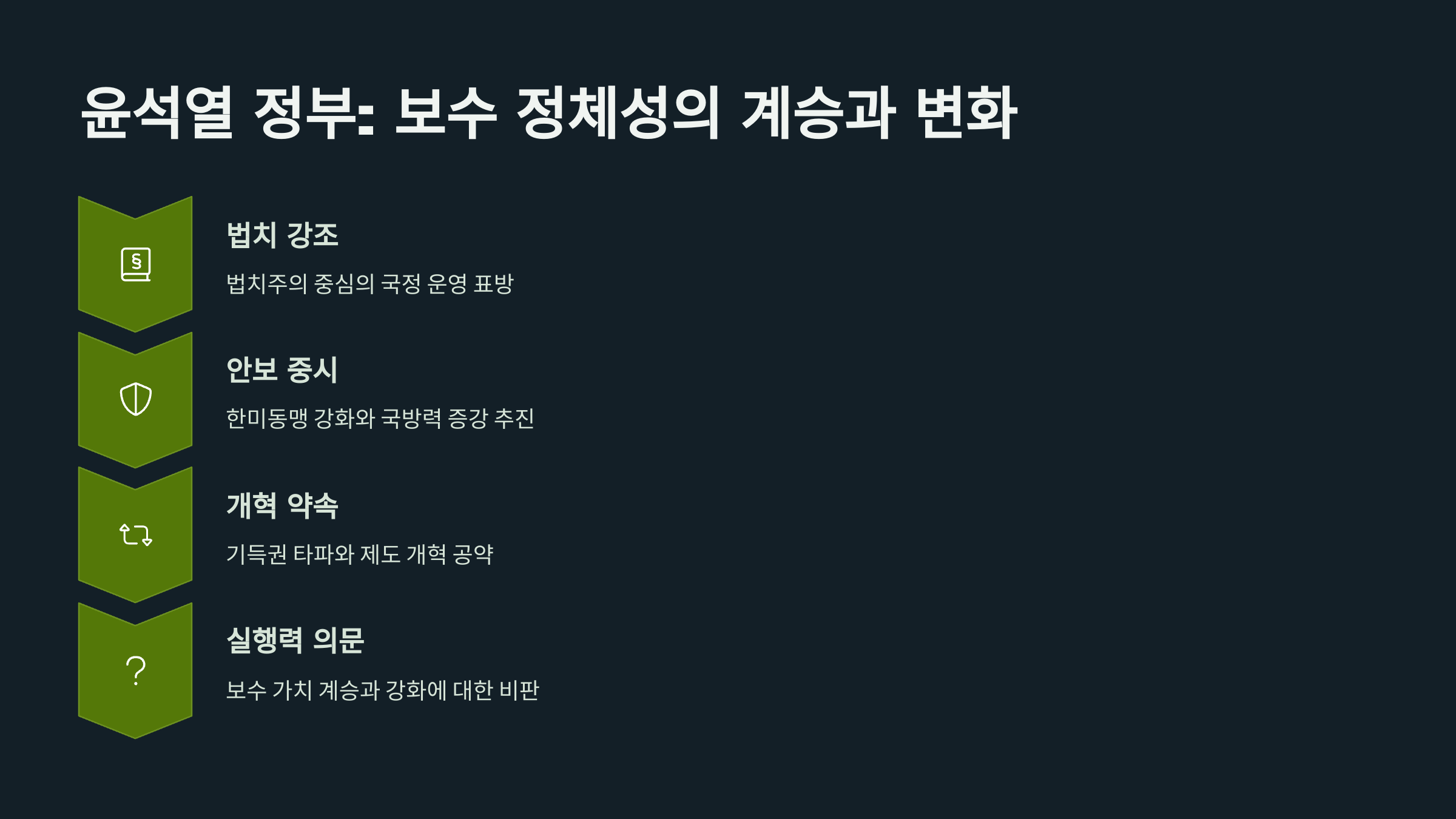 윤석열 대통령은 후보 시절부터 법치주의, 자유시장경제, 안보 중심의 정책 기조를 강조해왔습니다. 그러나 집권 이후 국민의힘과 정책 노선 간에 간극이 벌어지면서 정당과 대통령 간의 보수 가치 공유 여부에 대한 의문이 제기되고 있습니다. 보수 유권자들 사이에서도 "윤석열식 보수"를 정당이 계승하지 못한다는 평가가 나옵니다. 정당과 대통령이 동일한 철학을 공유하고, 이를 기반으로 정책을 실현해 나가는 것이 지금 국민의힘에 절실히 요구되는 과제입니다.