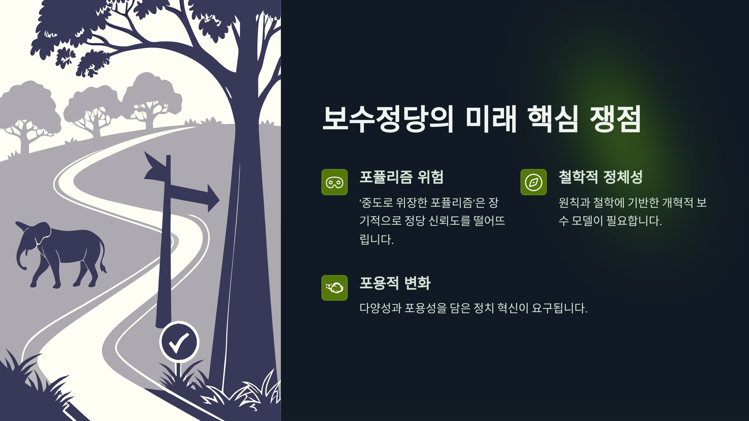 보수정당의 미래는 '중도로 위장한 포퓰리즘'이 아닌, 원칙과 철학 위에 선 개혁적 보수의 모습에 달려 있습니다.