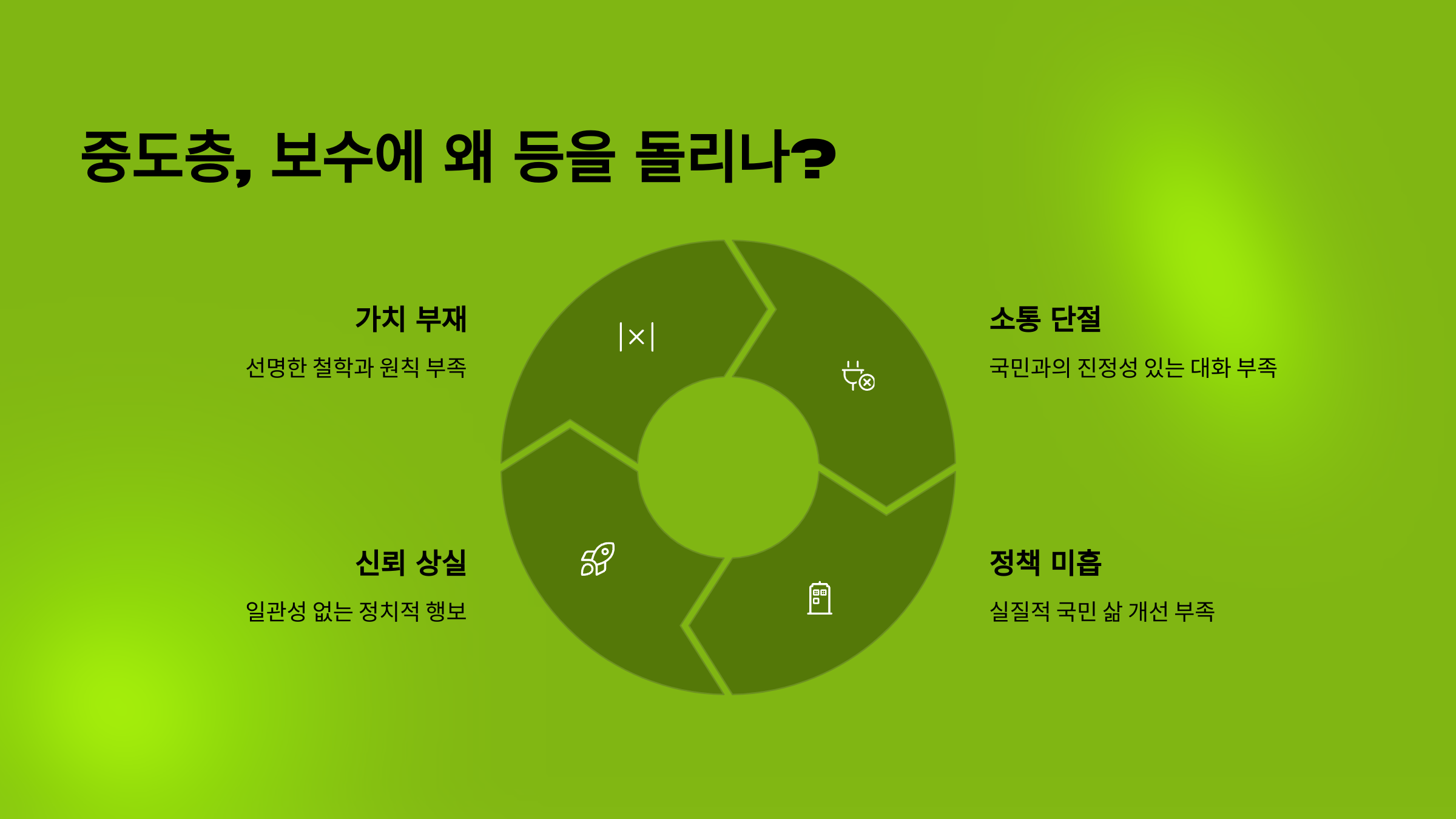 중도층은 원래부터 보수정당을 지지하지 않았기보다, 보수가 분명한 철학과 가치를 지녔을 때 따랐다는 분석이 설득력을 얻습니다.