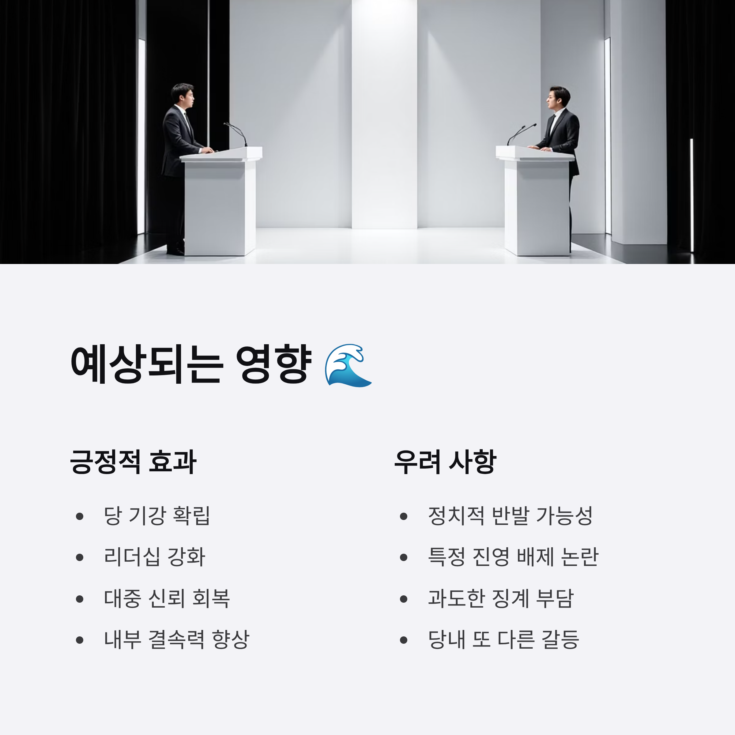 다만, 이 과정이 지나치게 강경하거나 특정 진영의 목소리를 배제하는 방식으로 진행될 경우, 내부와 외부에서 정치적 반발을 초래할 가능성도 존재합니다. 따라서 국민의힘은 이번 계기를 도전보다는 기회로 활용하여 대중에게 일관되고 신뢰할 만한 방향성을 제시해야 합니다.