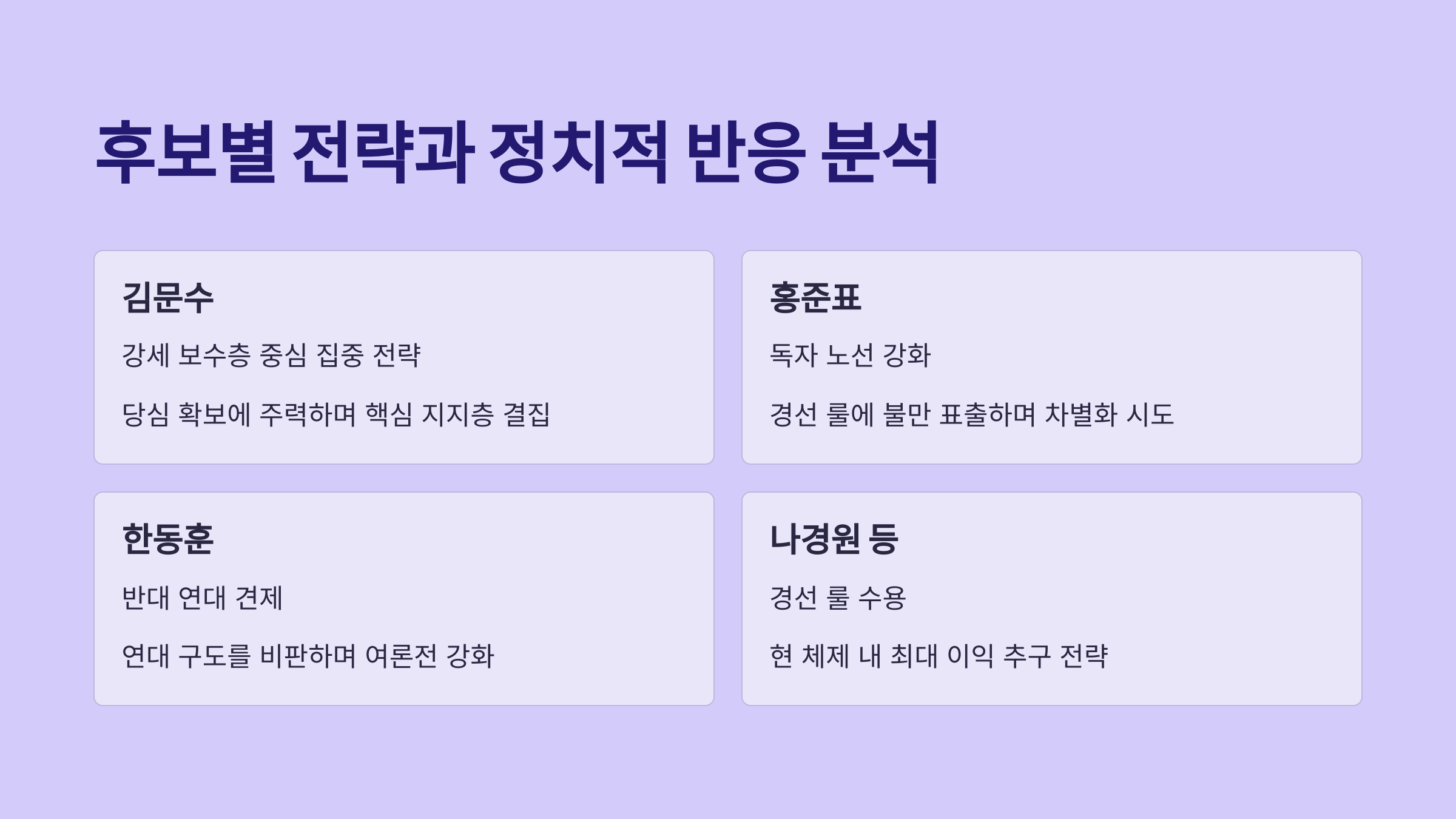 경선 룰 도입으로 인해 각 캠프는 유리한 고지를 선점하기 위한 전략적 셈법에 돌입했고, 결선투표 유무에 따라 향후 정계 개편이나 합종연횡 가능성도 배제할 수 없습니다. 정치적 불확실성과 함께, 경선 결과는 예측불가의 단계에 접어들었습니다.