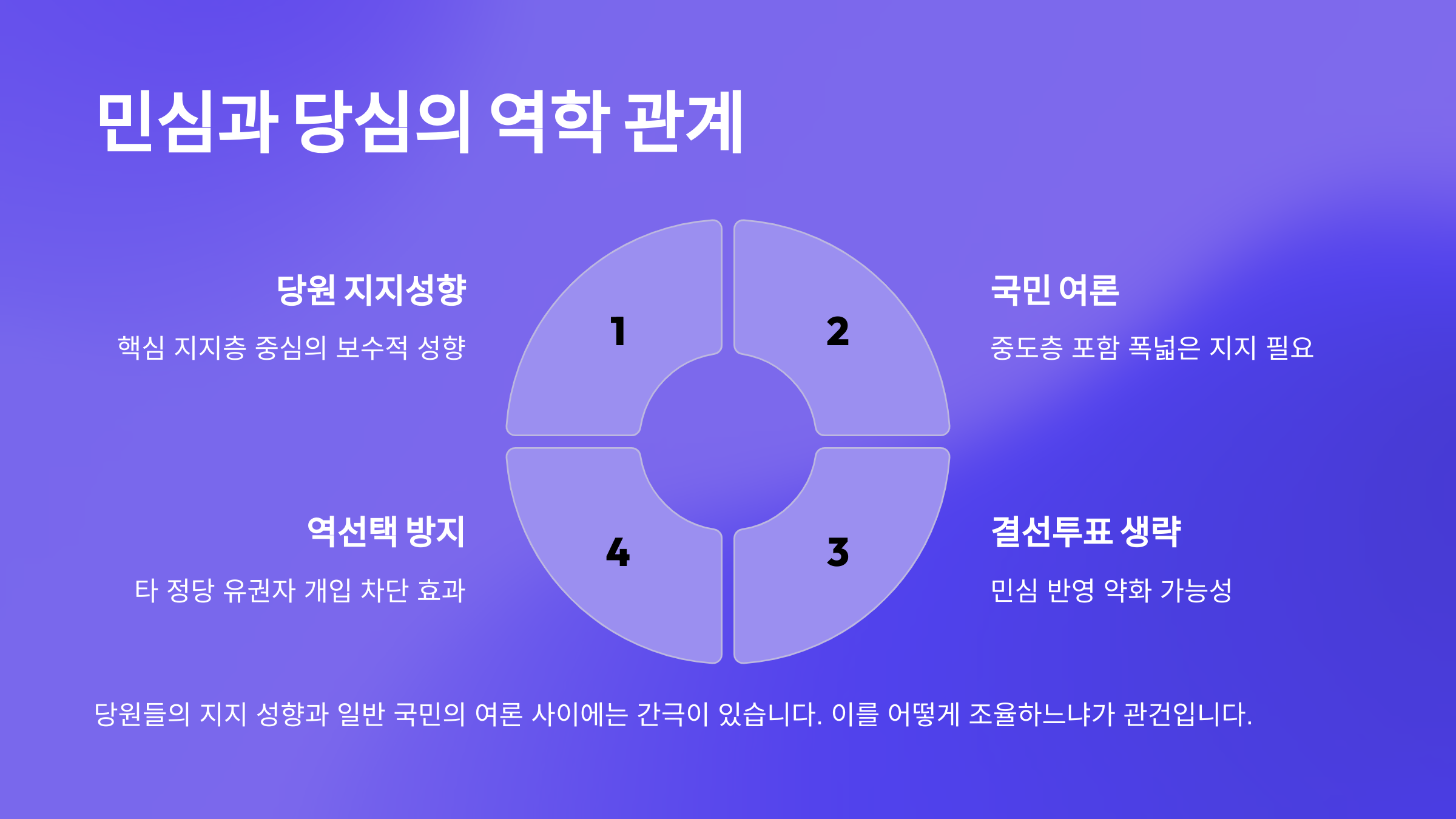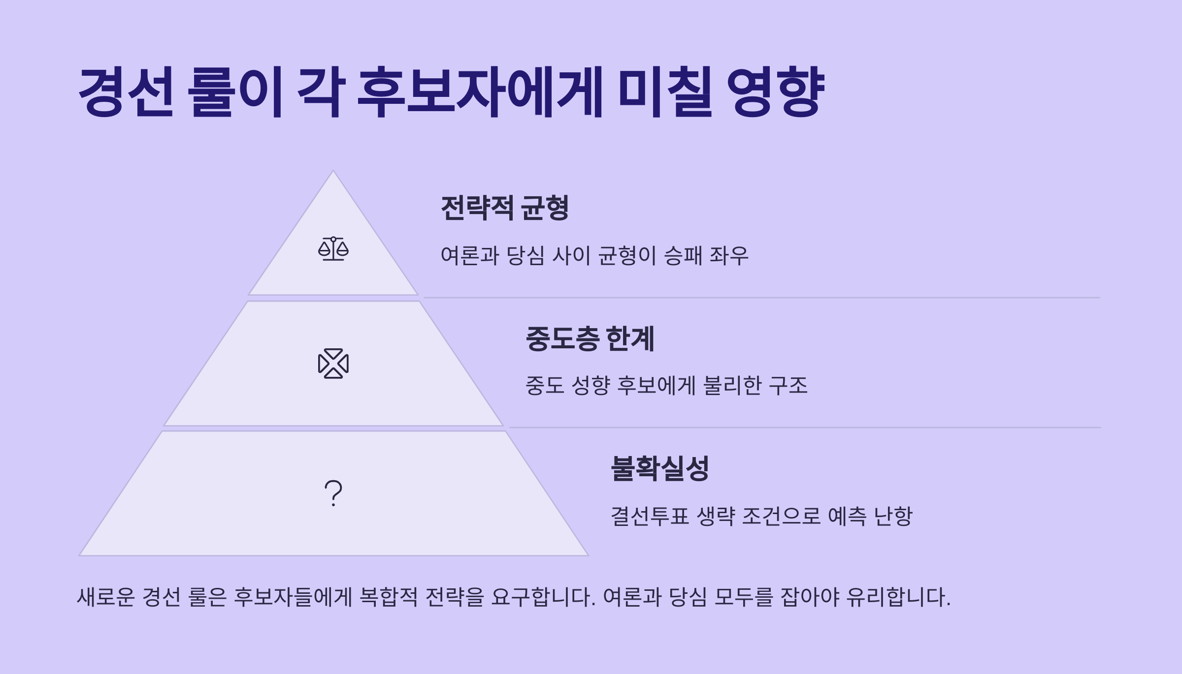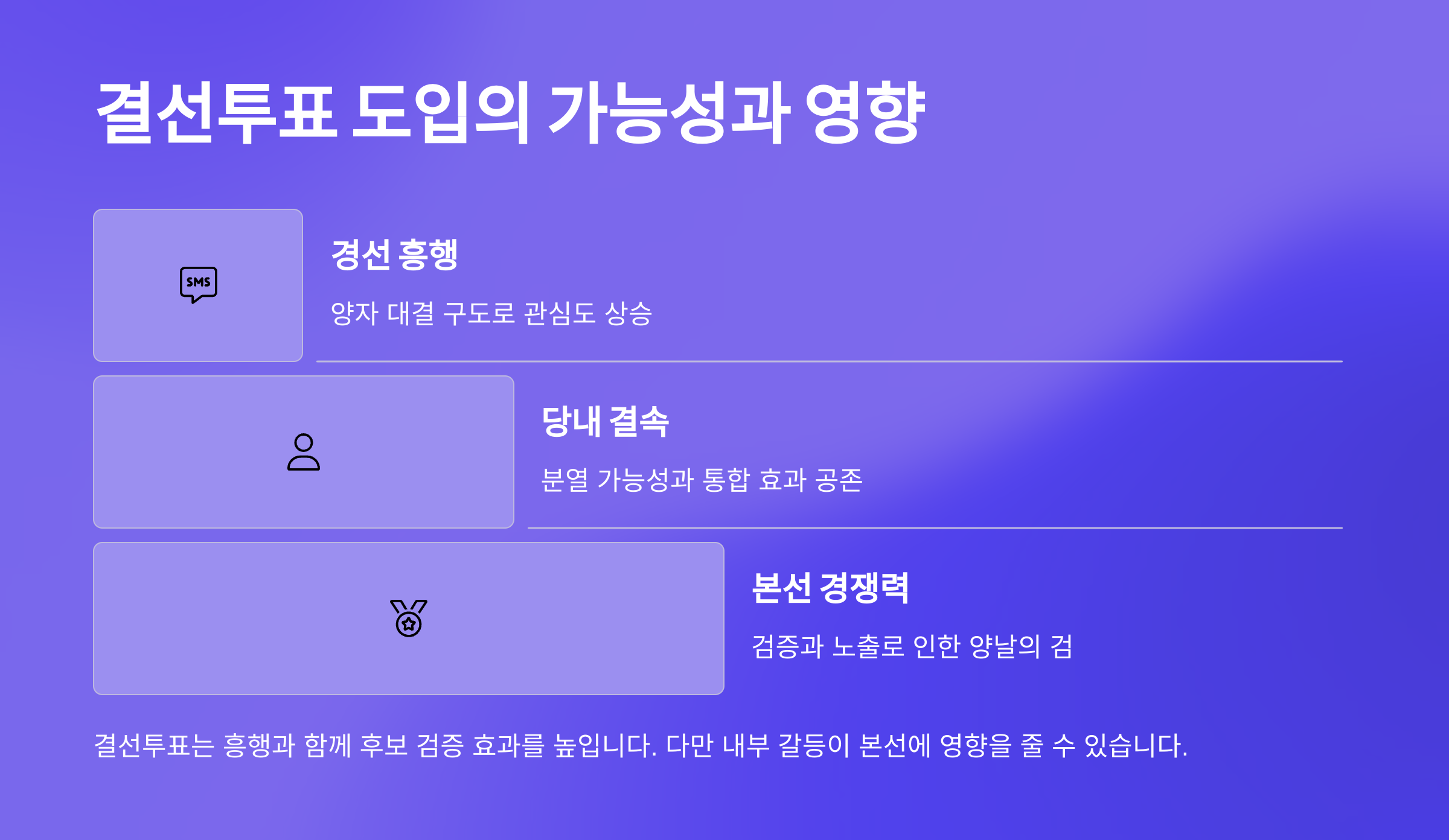 결선 투표 제도는 선거의 정당성과 대표성을 확보할 수 있는 장점이 있지만, 동시에 정치적 연합과 이해타산의 장이 되기도 합니다. 2인 결선 구조에서는 각 후보의 합종연횡이 본격화되며, 단일화 또는 전략적 양보가 빈번히 일어날 수 있습니다. 이는 당내 역학 관계에 큰 변화를 줄 가능성이 있습니다.