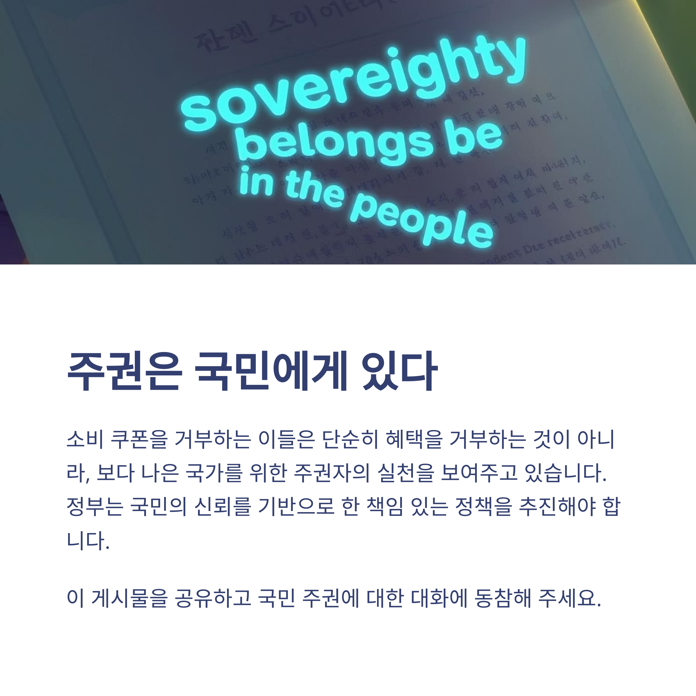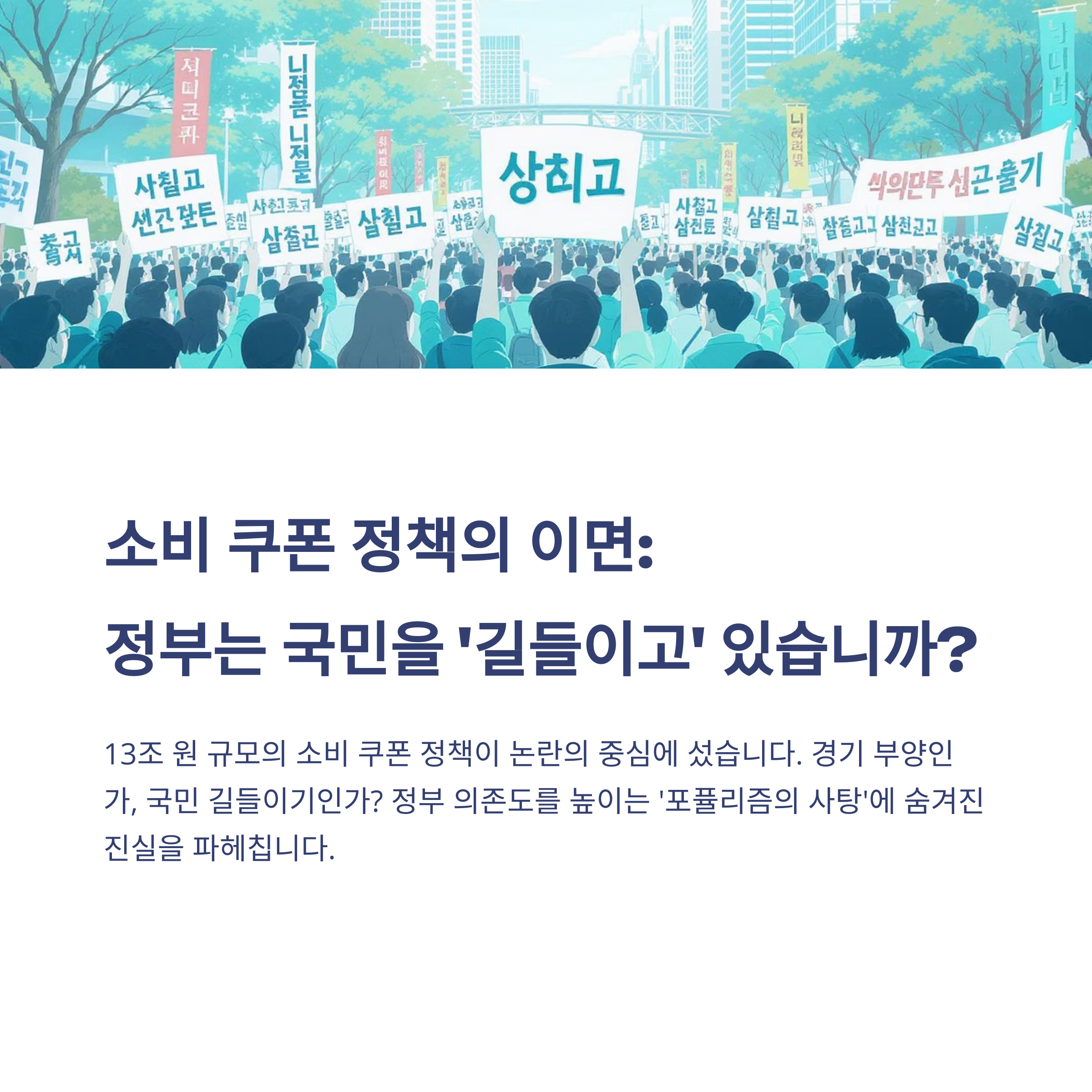 현재 온라인을 중심으로 자발적으로 확산되고 있는 ‘소비 쿠폰 거부 운동’은 단순한 반대의 표현이 아닙니다. 이는 국민들이 주권자로서의 자각을 시작했다는 신호이기도 합니다. 정책의 수혜자가 되는 대신, 그 정책이 가져올 장기적 위험을 경계하고, 보다 근본적인 해결책을 요구하는 움직임입니다.