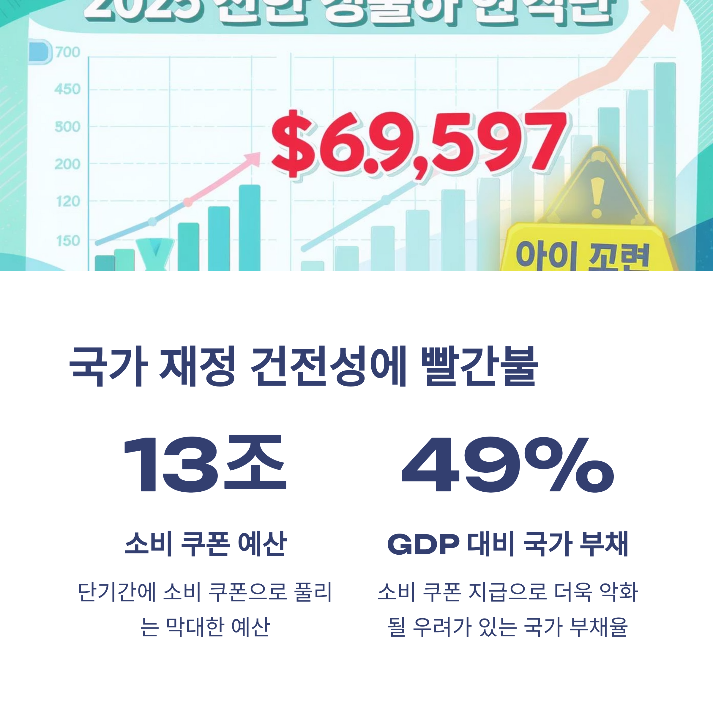 13조 원이라는 막대한 예산을 단기간에 소비 쿠폰으로 풀게 되면, 당연히 국가는 추가적인 재원을 마련해야 합니다. 이는 국채 발행과 국가 부채 증가로 이어지며, 결국 재정 건전성에 심각한 위협이 됩니다. 특히, GDP 대비 국가 부채가 49%에 달하고 공공기관 부채까지 합치면 그 수치는 더욱 심각해집니다.