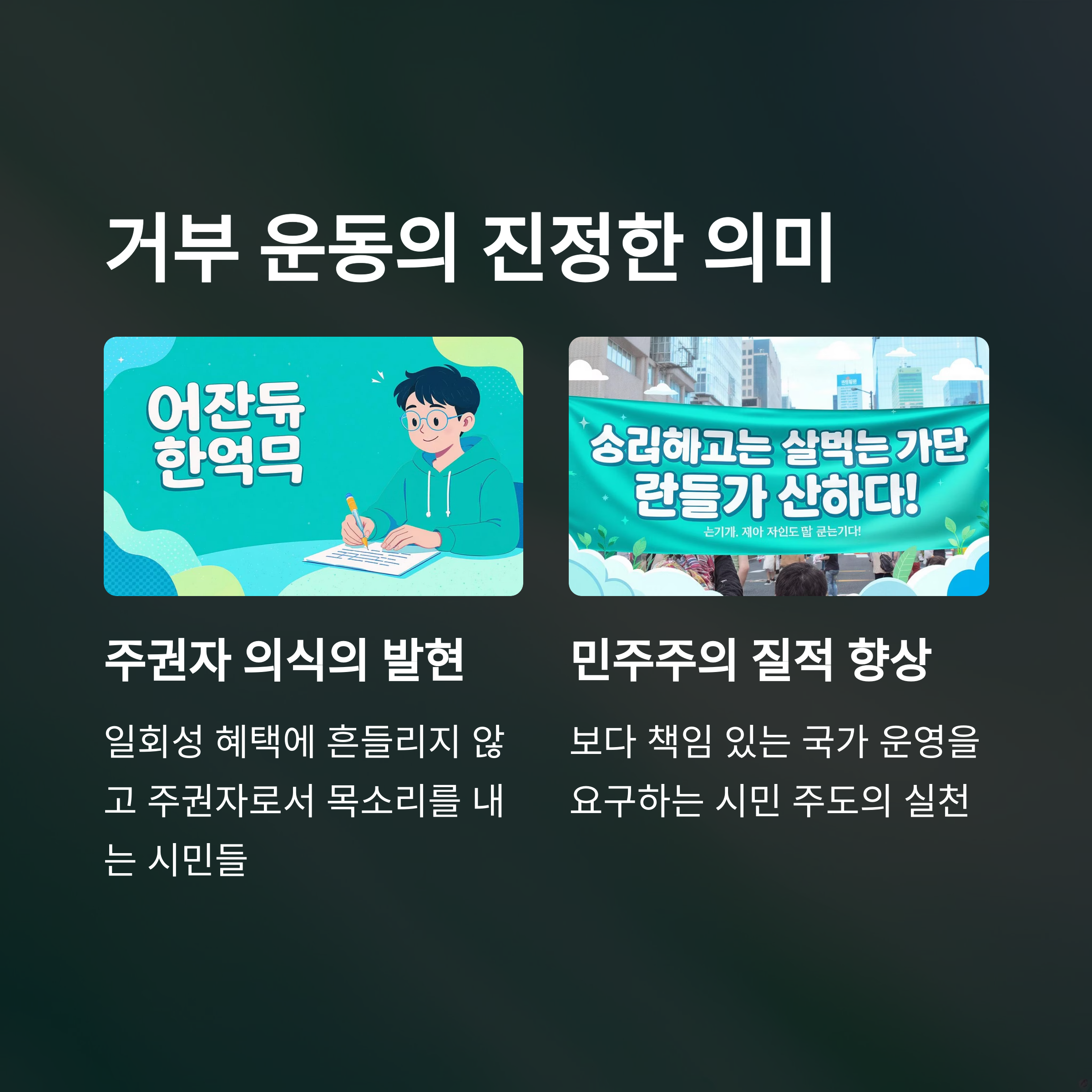 A. 실질적으로 직접적인 변화는 없지만, 거부 운동은 사회적 여론 형성과 정책 변화에 영향을 줄 수 있습니다. 국민의 자각과 저항 의지를 보여주는 상징적 행동입니다.