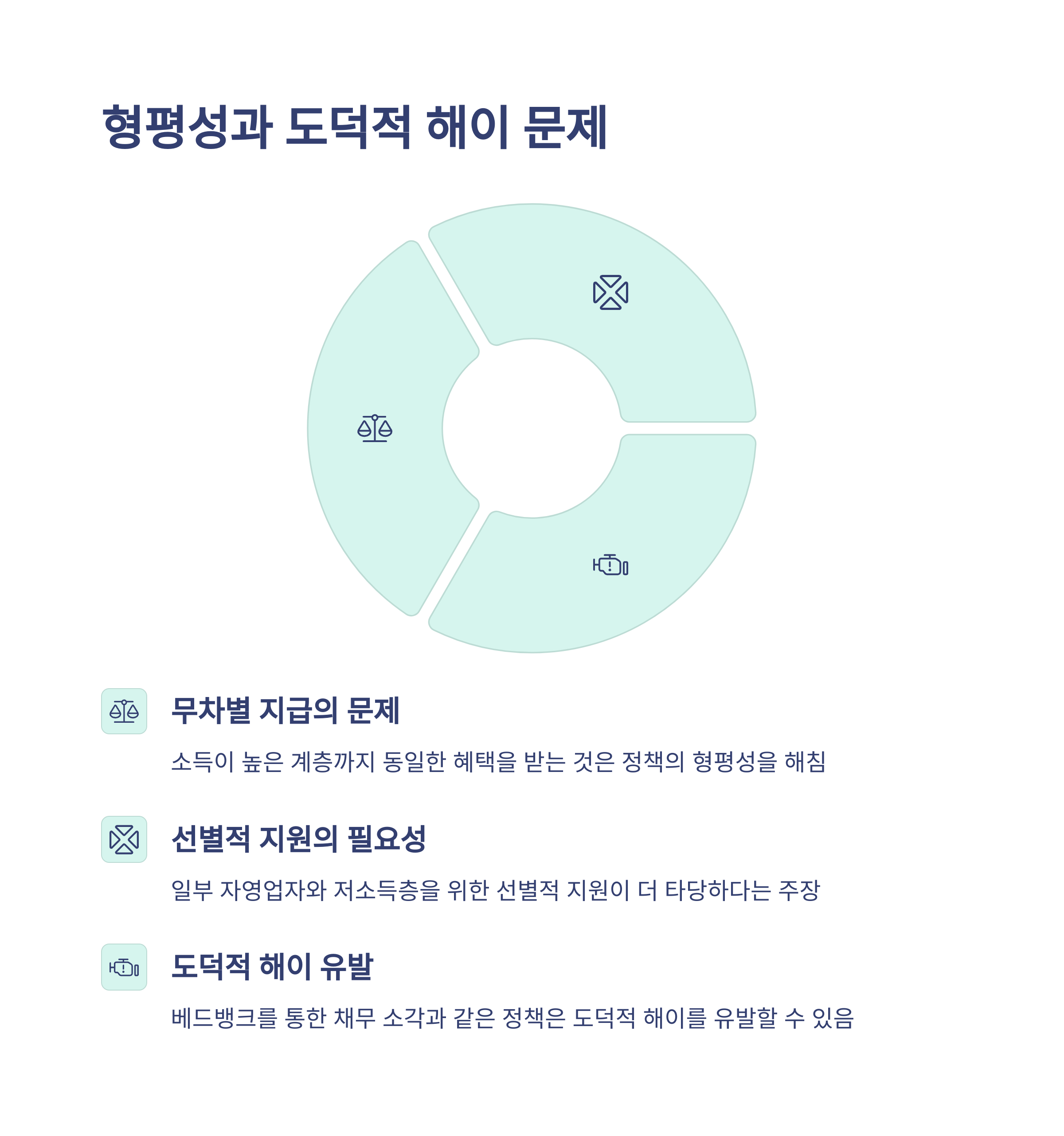 뿐만 아니라, 소득이 높은 계층까지 동일한 수준으로 혜택을 받는 무차별 지급은 정책의 형평성을 해치는 결과를 낳습니다. 일부 자영업자와 저소득층을 위한 선별적 지원이 오히려 더 타당하다는 주장도 있습니다. 베드뱅크를 통한 채무 소각도 마찬가지로 도덕적 해이를 유발할 수 있어, 이러한 정책은 단기 인기만을 노린 포퓰리즘이라는 비판이 더욱 설득력을 얻고 있습니다.