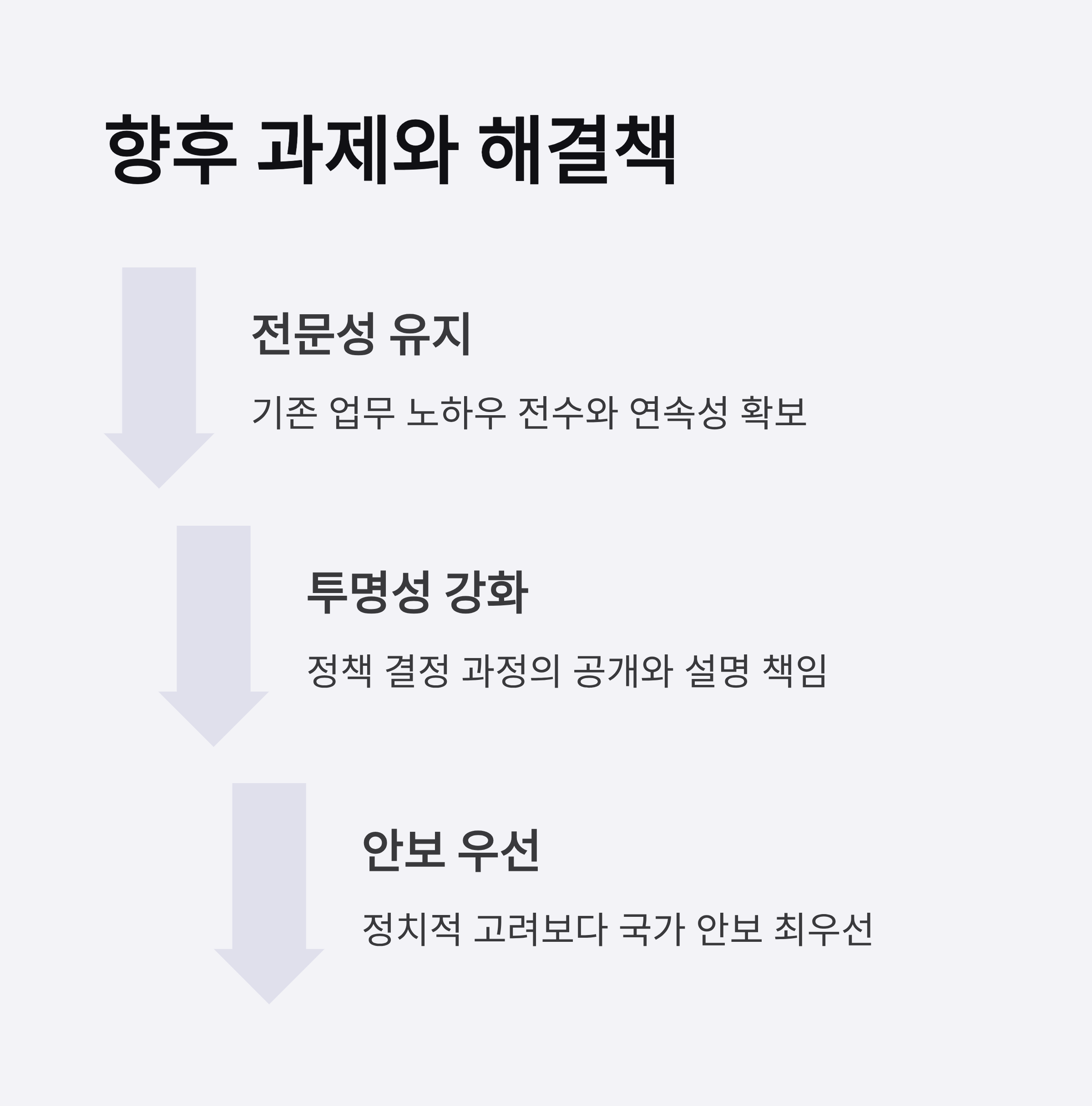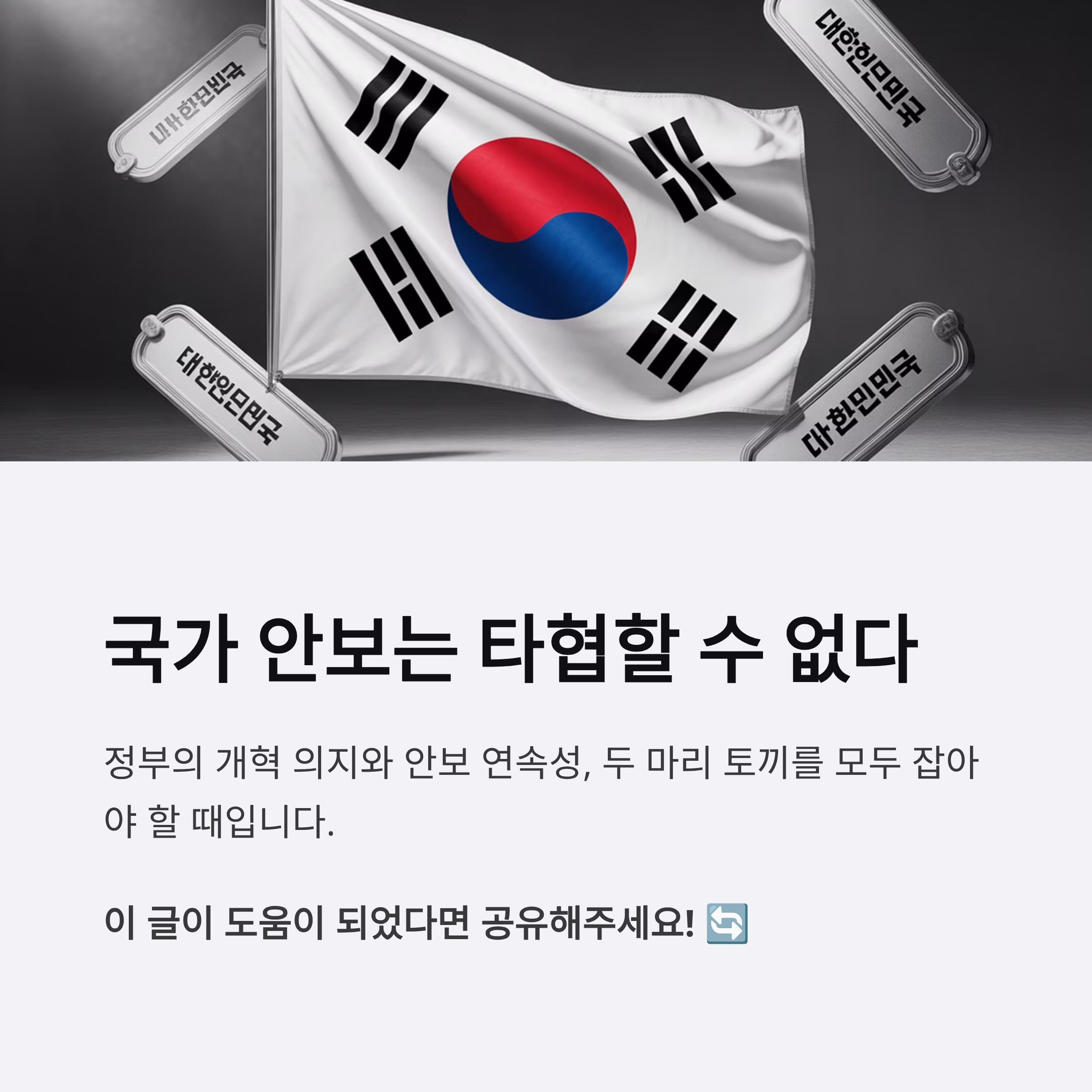 정부가 추구하는 개혁의 이상이 현실에서 안전하게 작동하려면, 기존 업무에 대한 전문성을 유지하는 동시에 정책적 투명성을 갖춰야 합니다. 안보는 단기간 성과로 판단할 수 없습니다. 국민의 안정된 일상을 지키는 기반으로서 안보의 중요성이 강조되는 시점입니다.