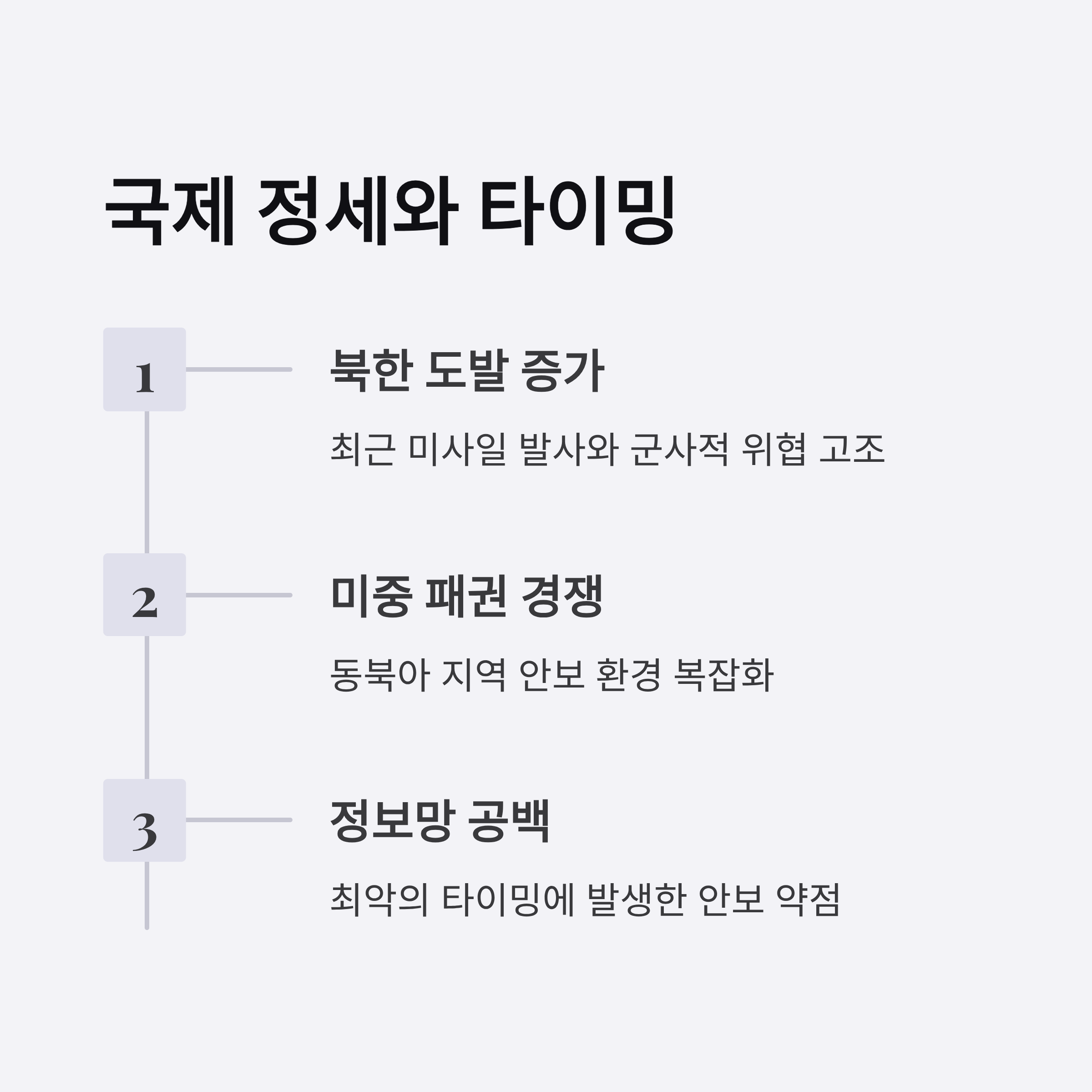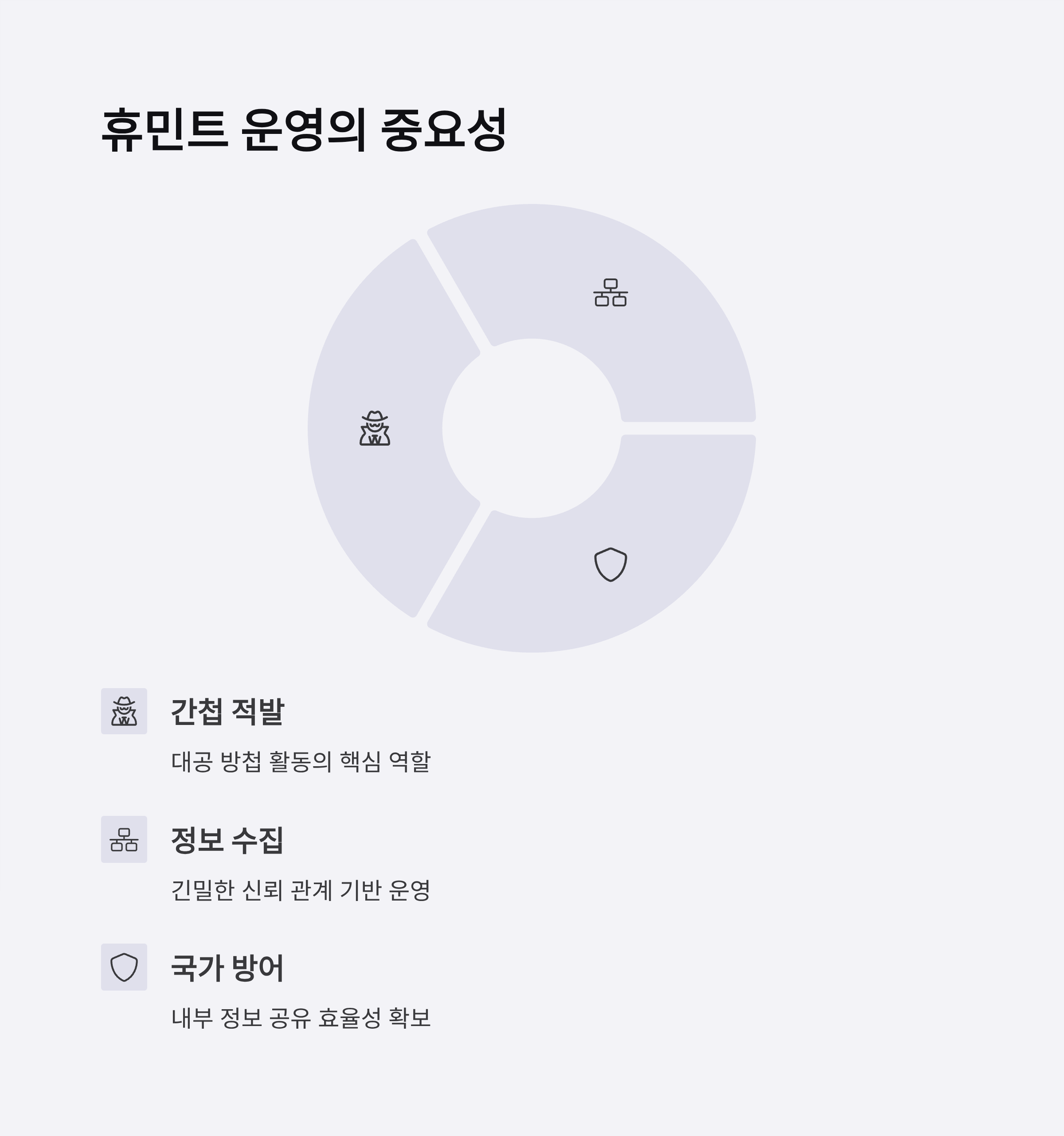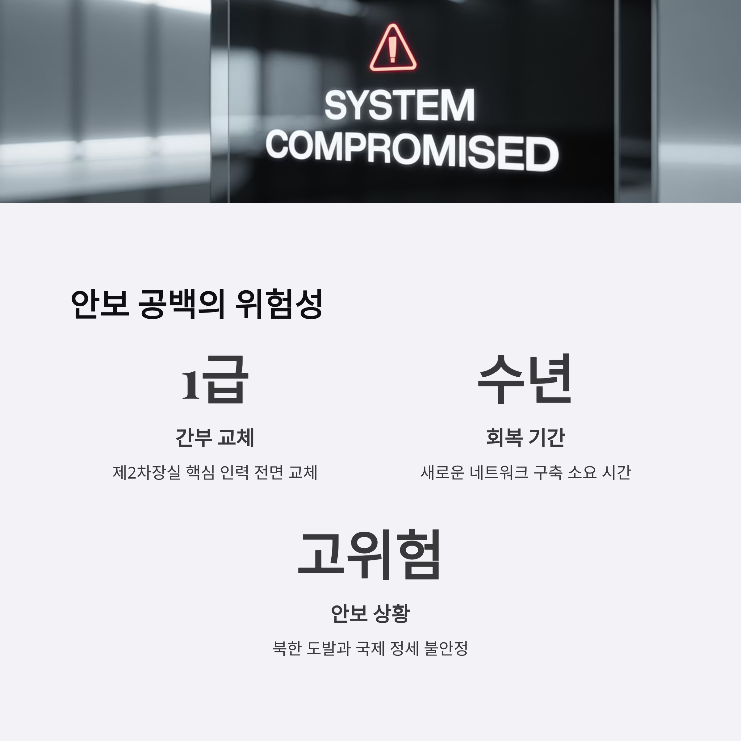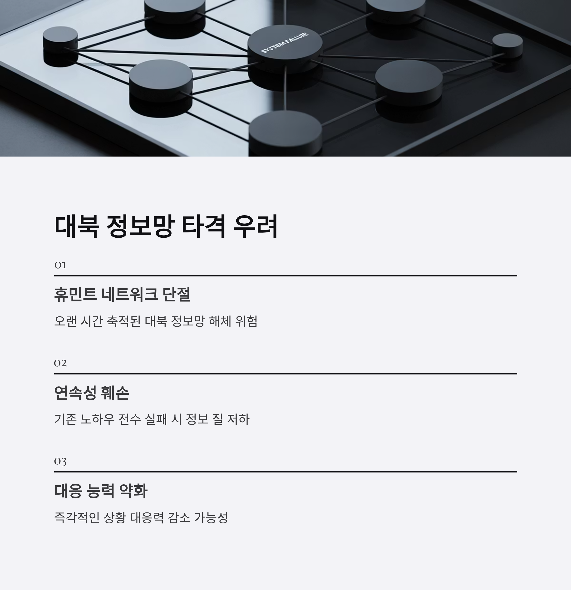 최근 북한의 도발과 미국, 중국 간의 패권 경쟁이 심화되는 환경을 고려할 때, 대북 정보망의 일시적 공백은 국가 안보 전략의 약점으로 작용할 가능성이 큽니다. 특히 휴민트 운영의 공백은 나머지 국가 정보망에도 파급 효과를 미칠 수 있으며, 대공 방첩 활동 또한 느려지게 만드는 요인이 될 수 있습니다. 이는 간첩 활동 적발의 감소, 내부 정보 공유 효율 저하 등으로 이어질 수 있습니다.