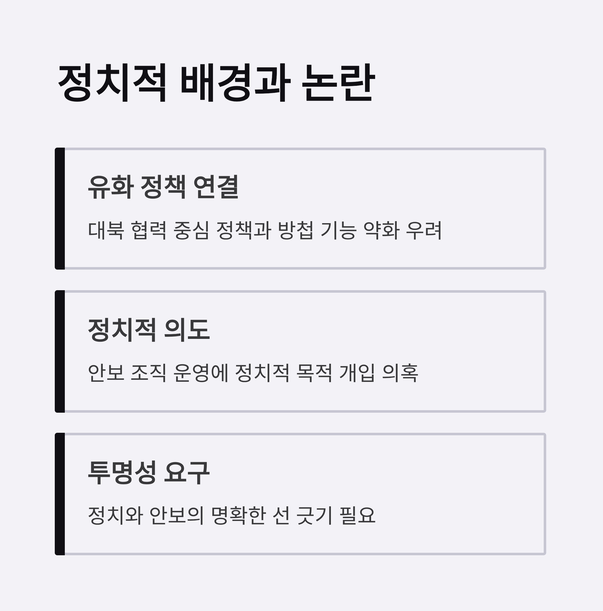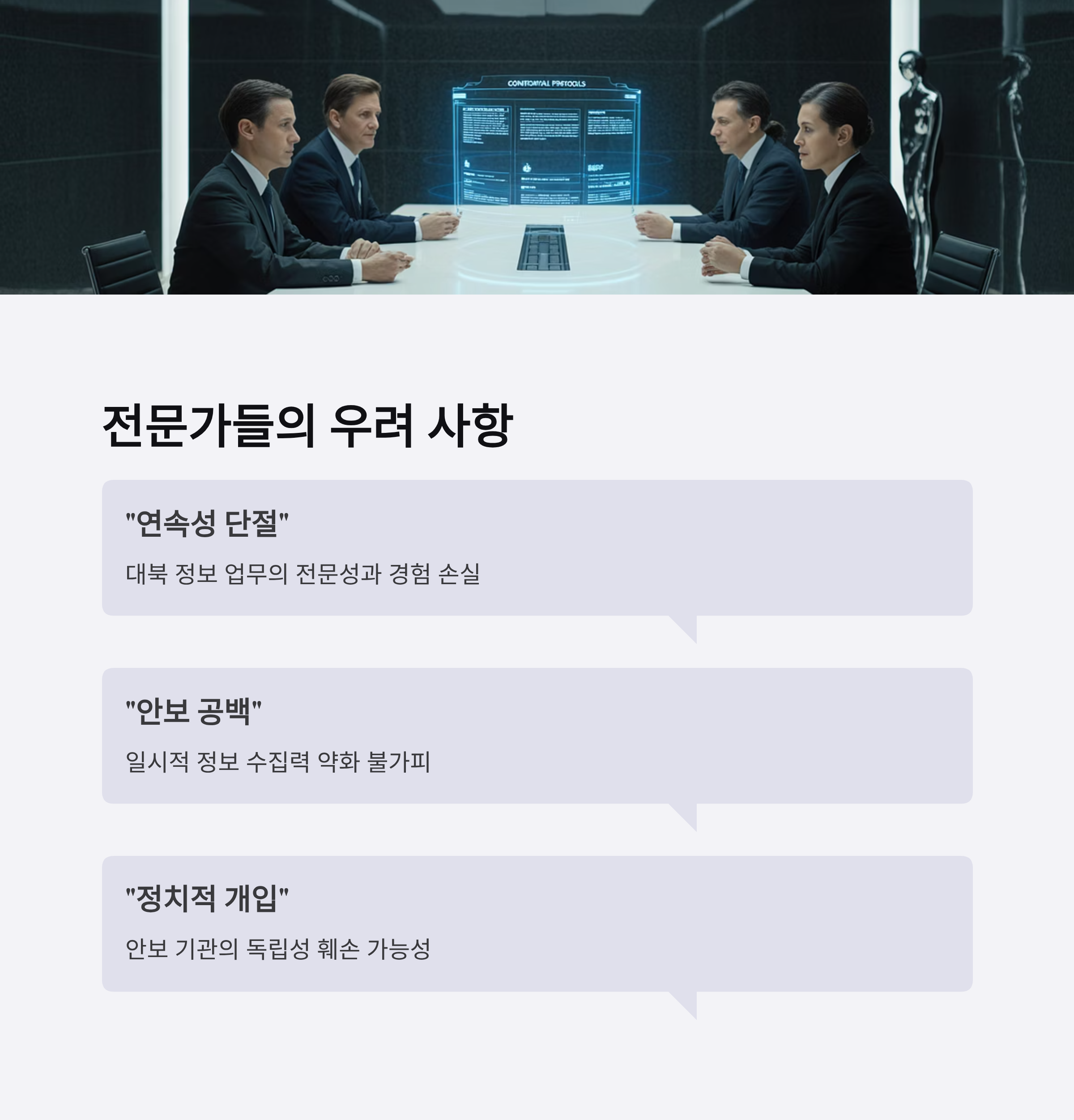 정권의 정치적 목적 하에 안보 조직 운영의 핵심이 흔들릴 수 있음을 경고하며, 정책적 투명성이 요구됩니다.