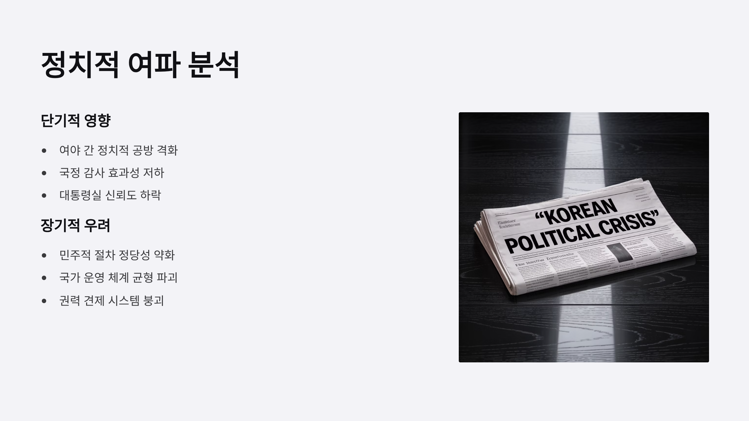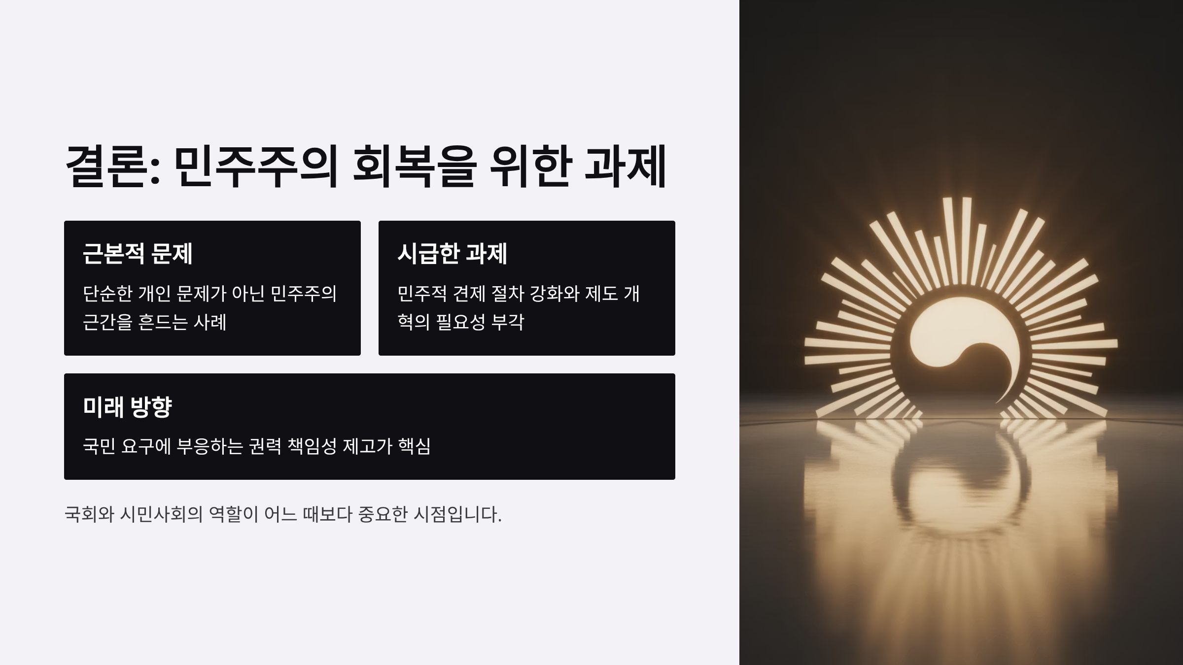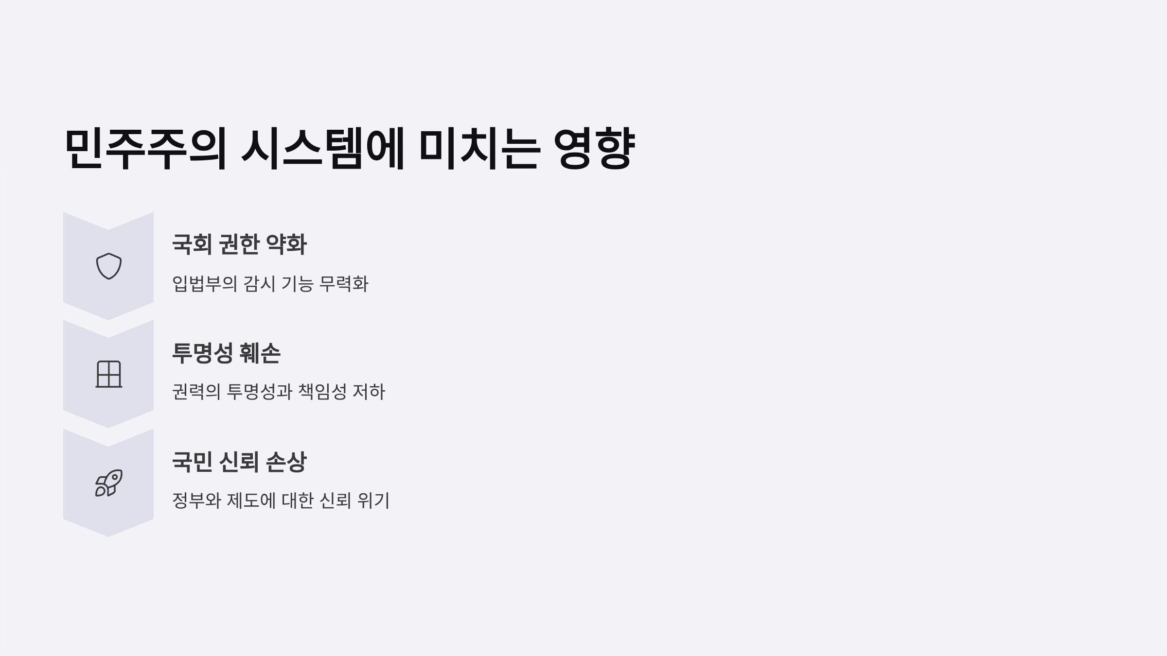 민주주의 시스템을 약화시키는 이러한 행태는 투명성과 국민 신뢰를 훼손함.