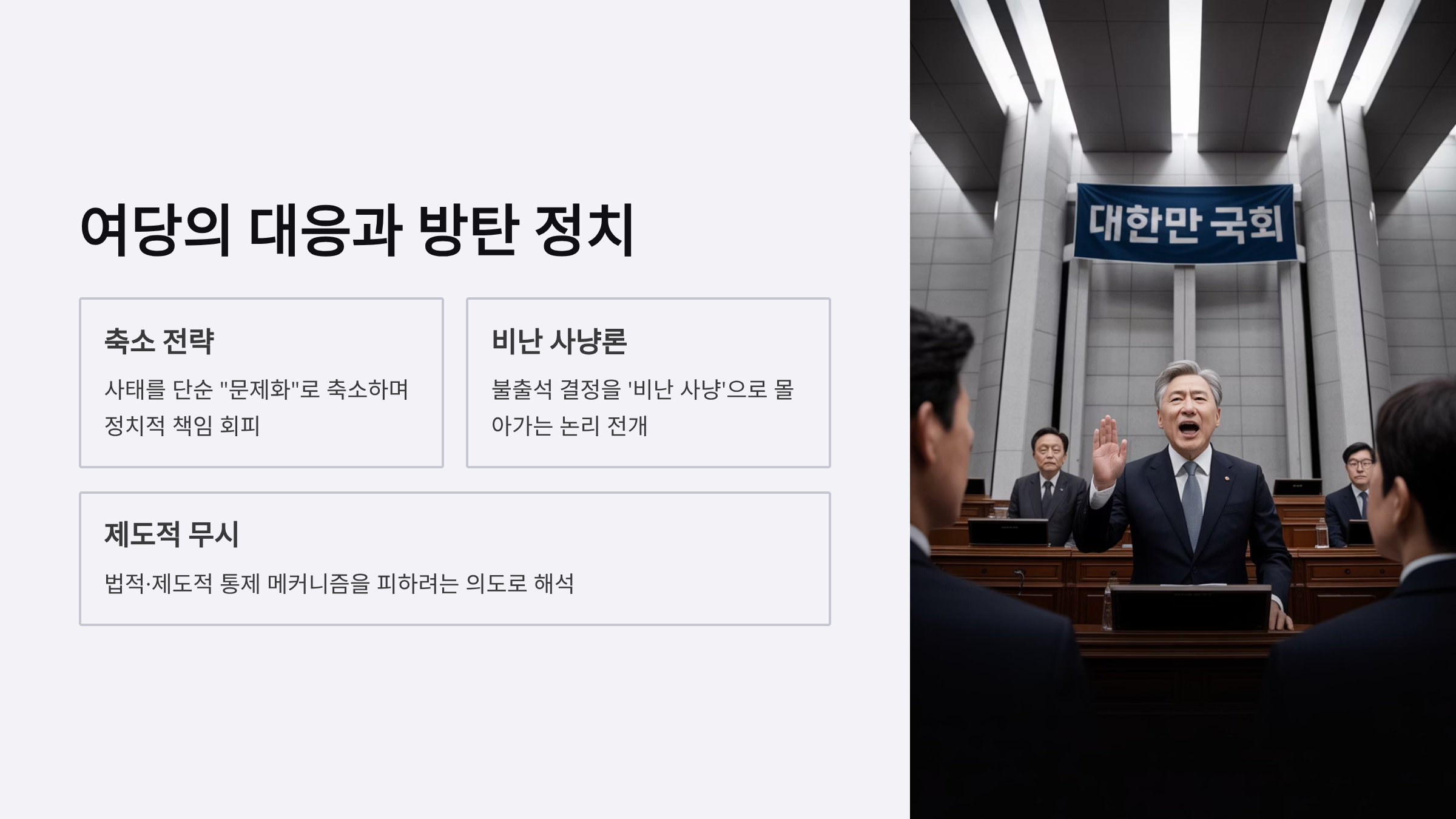 여당은 이 사태를 단순 "문제화"로 축소하고 있으나, 이는 정치적 책임 회피로 간주되고 있음.