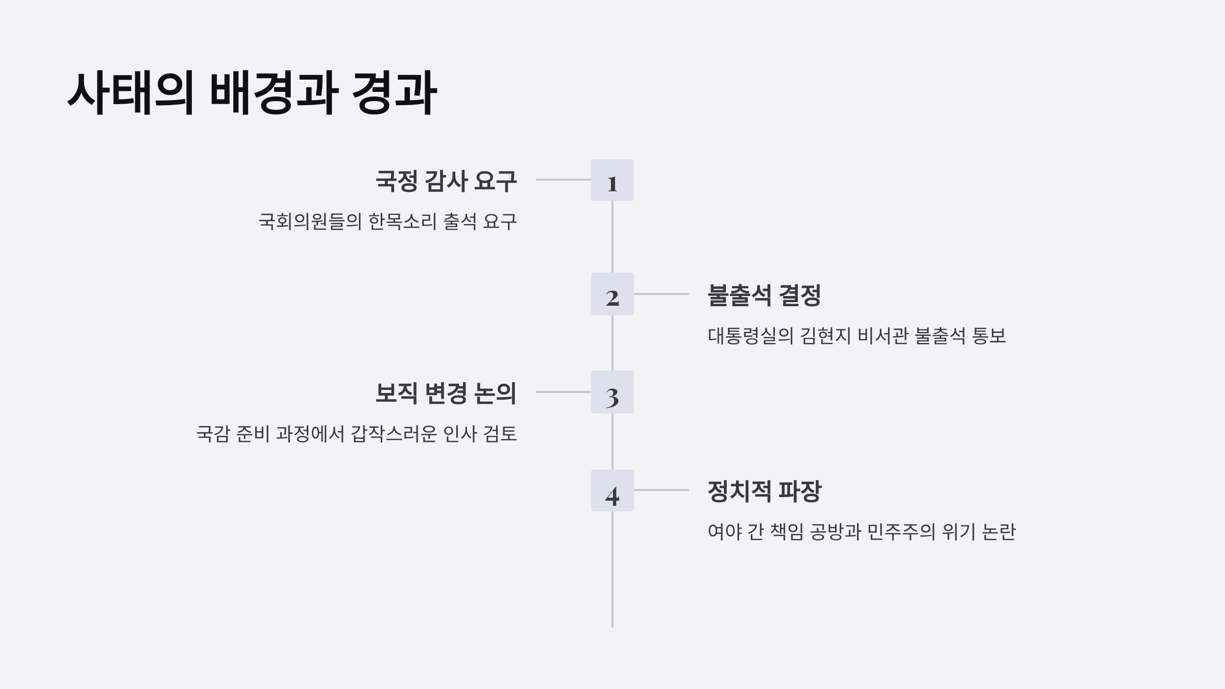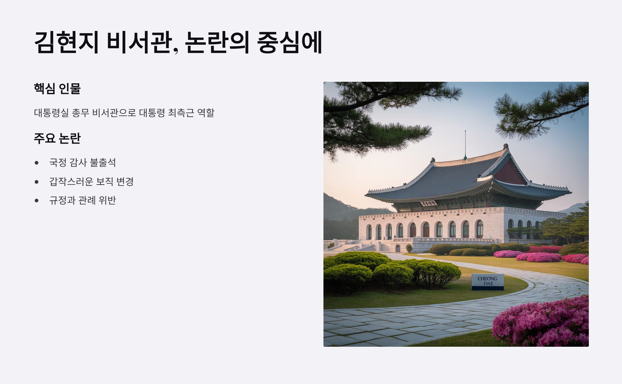 국정 감사는 대한민국 헌법이 보장하는 중요한 국회 권한으로, 정부의 운영 상태를 점검하고 국민을 대신해 권력을 감시하는 제도적 장치입니다. 하지만 최근 대통령실 총무 비서관인 김현지의 국정 감사 불출석과 갑작스러운 보직 변경 논란이 일어나면서, 규정과 관례를 위반하고 권력의 투명성을 희생시키는 사건으로 주목받고 있습니다. 이러한 상황은 단순히 한 공직자의 문제를 넘어 대한민국 민주주의 시스템의 위기라는 큰 틀에서 바라봐야 합니다. 본 기사는 이 사태의 배경을 살펴보고, 정치적·사회적 의미를 파악하며 국민적 우려와 제언을 제시하고자 합니다.