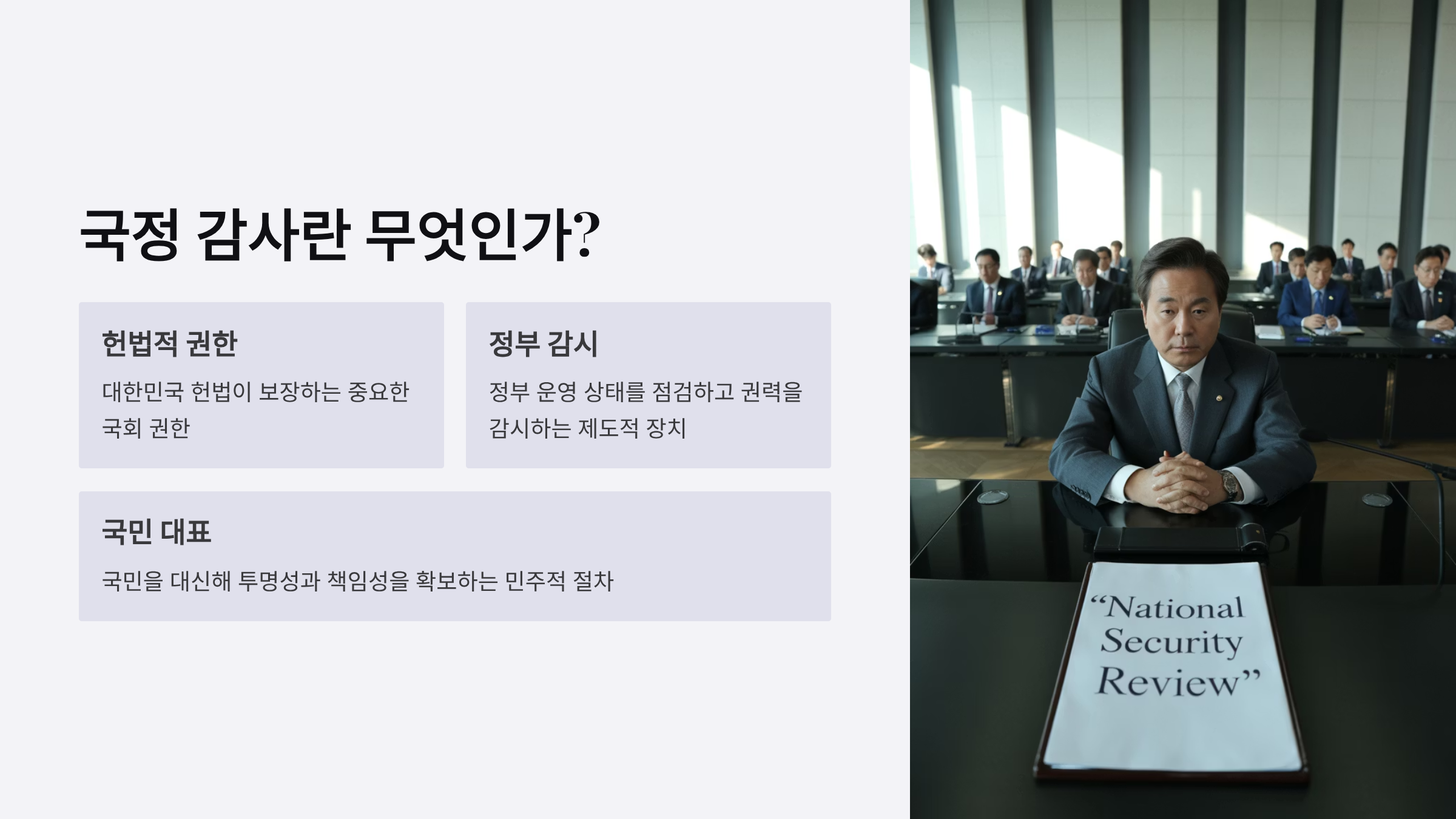 국정 감사는 국민의 권리를 보호하고 공공 권력을 감시하는 제도적 장치로 중요한 의의를 가짐.