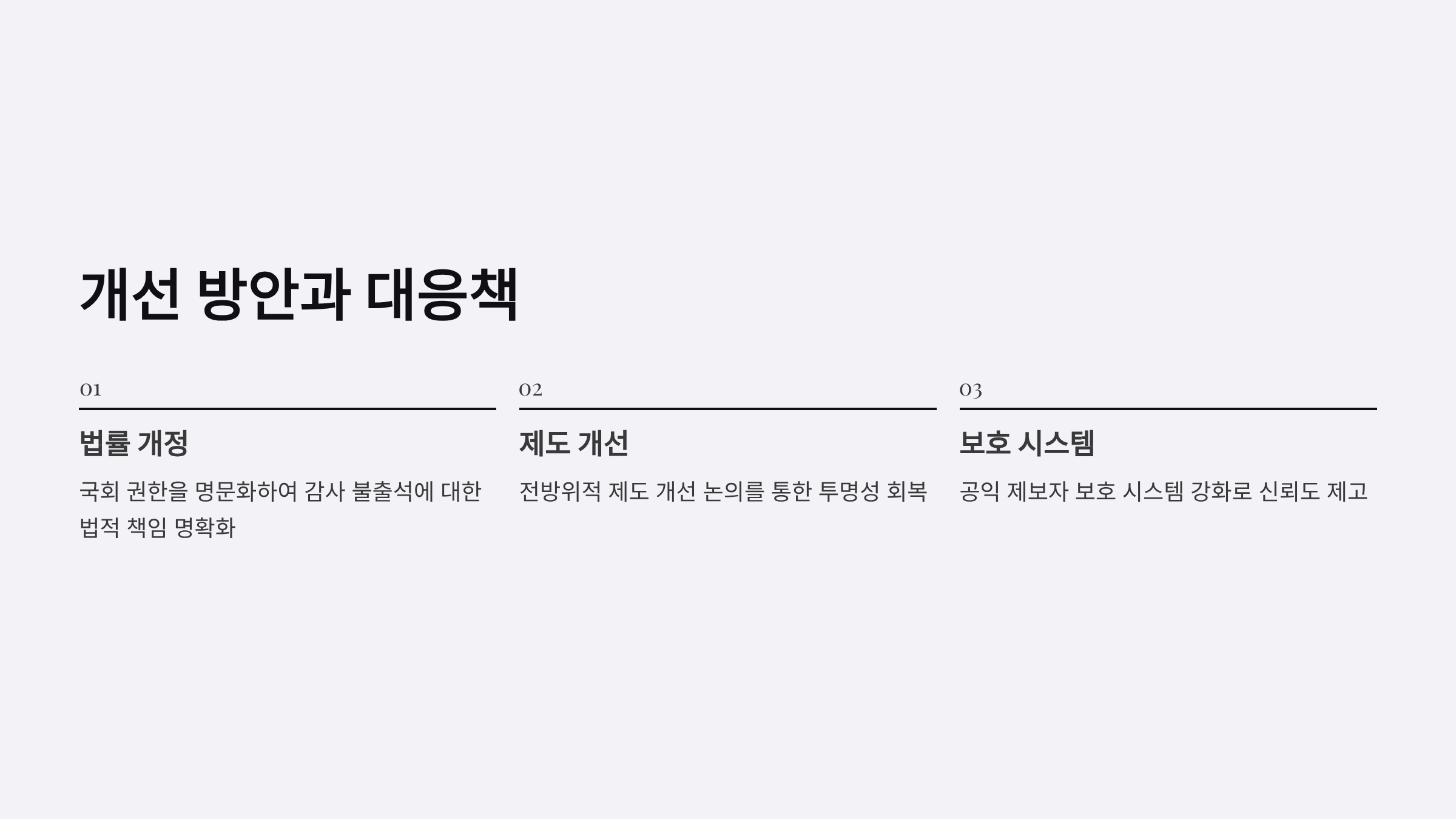 | A. 국회의 권한을 명문화하여 감사 불출석에 대한 법적 책임을 명확히 하고, 공익 제보자 보호 시스템을 강화해야 합니다. 이를 통해 국정 운용의 투명성과 신뢰도를 높일 수 있습니다. |
