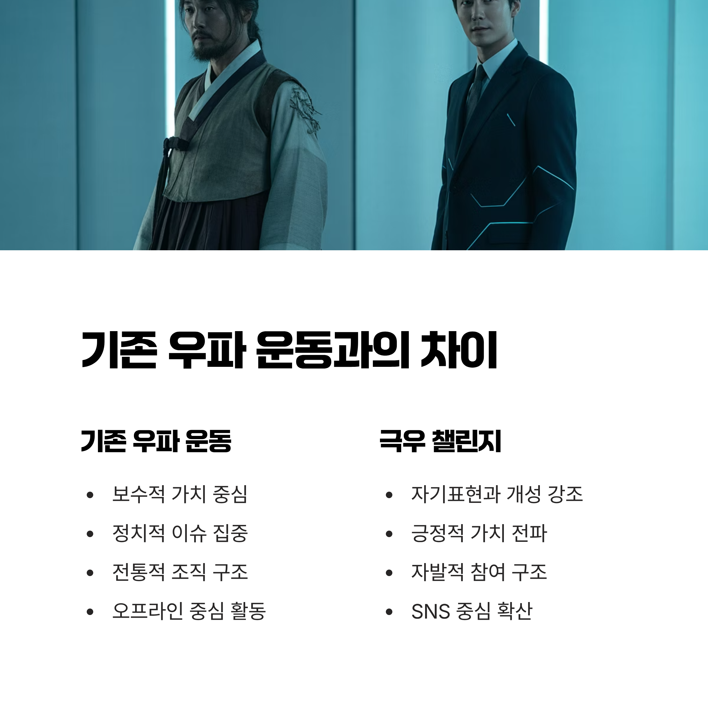 A. 기존 우파 운동이 보수적 가치와 정치적 이슈에 집중했다면, 극우 챌린지는 신세대의 자기 표현과 긍정적 가치 전파를 중점으로 두고 있습니다. 이는 자신감과 개성을 어필하려는 점에서 차별화됩니다.