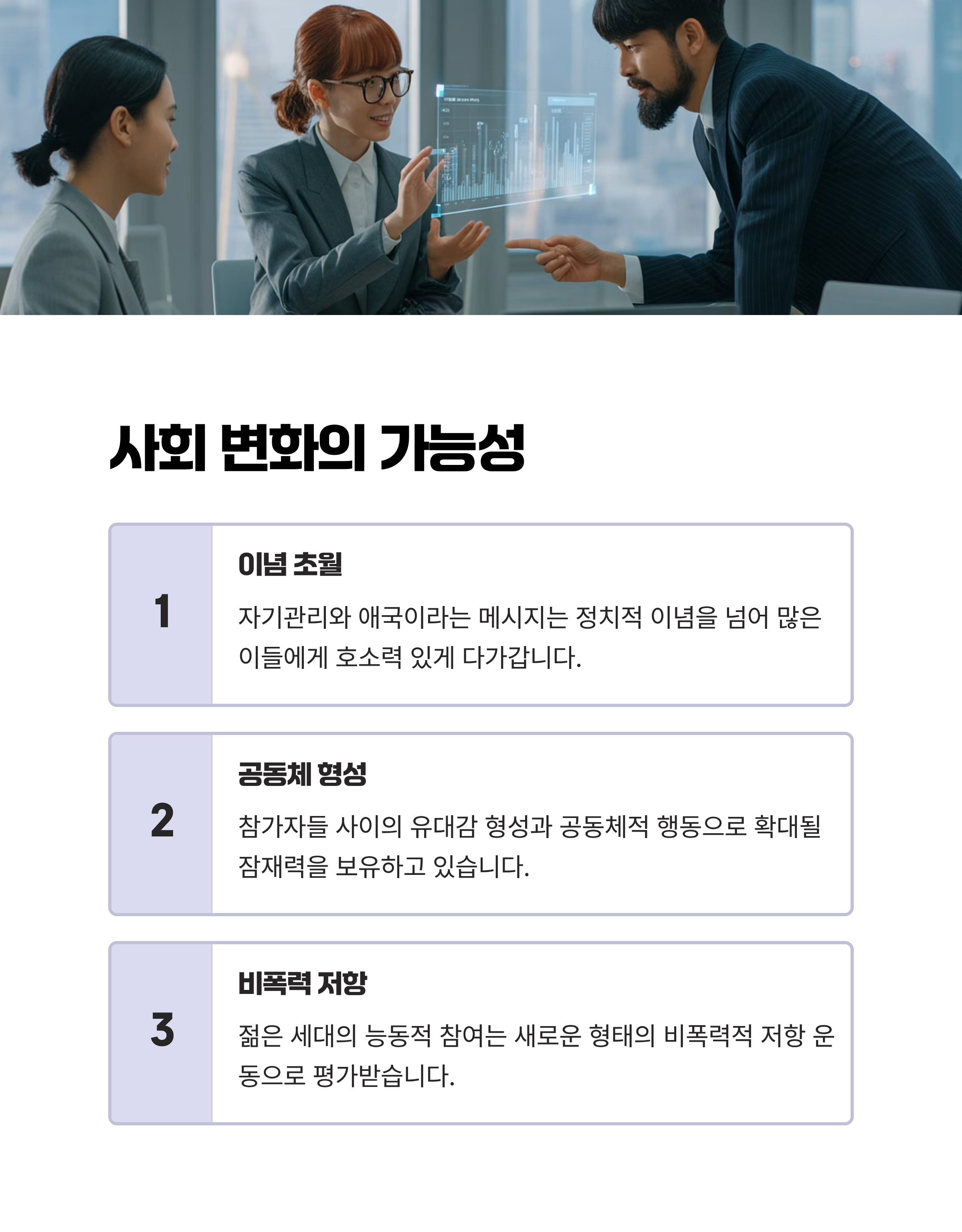 젊은 세대의 능동적 참여는 새로운 형태의 비폭력적 저항 운동으로 평가받을 수 있으며, 동시에 정치적 다양성을 되찾고 부정적 프레임에서 벗어난 균형 잡힌 담론 형성에 기여할 잠재력을 가지고 있습니다.