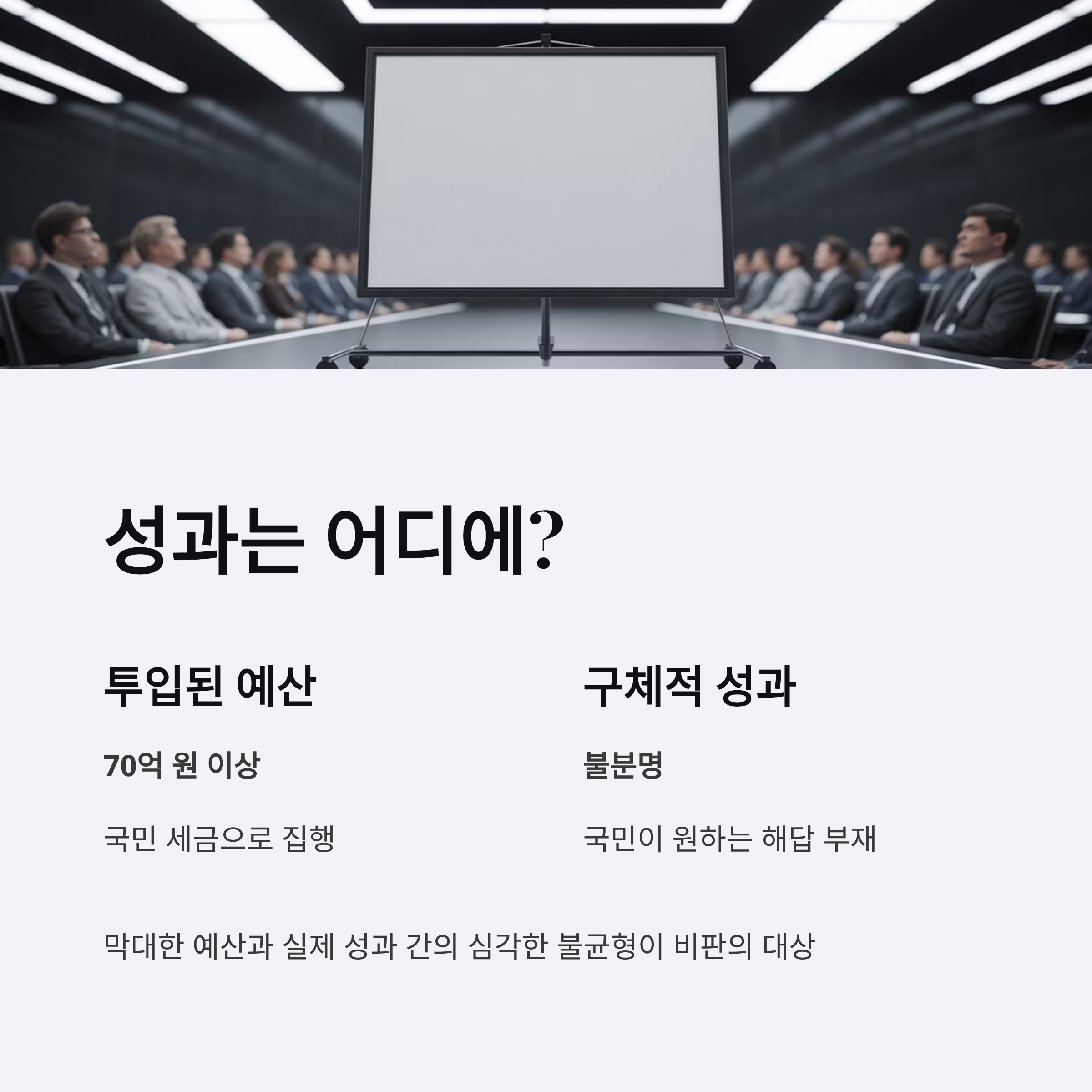- 현재까지 주요 성과가 불분명하며, 막대한 예산과 결과물 사이의 균형 문제 역시 화두로 떠오르고 있습니다.