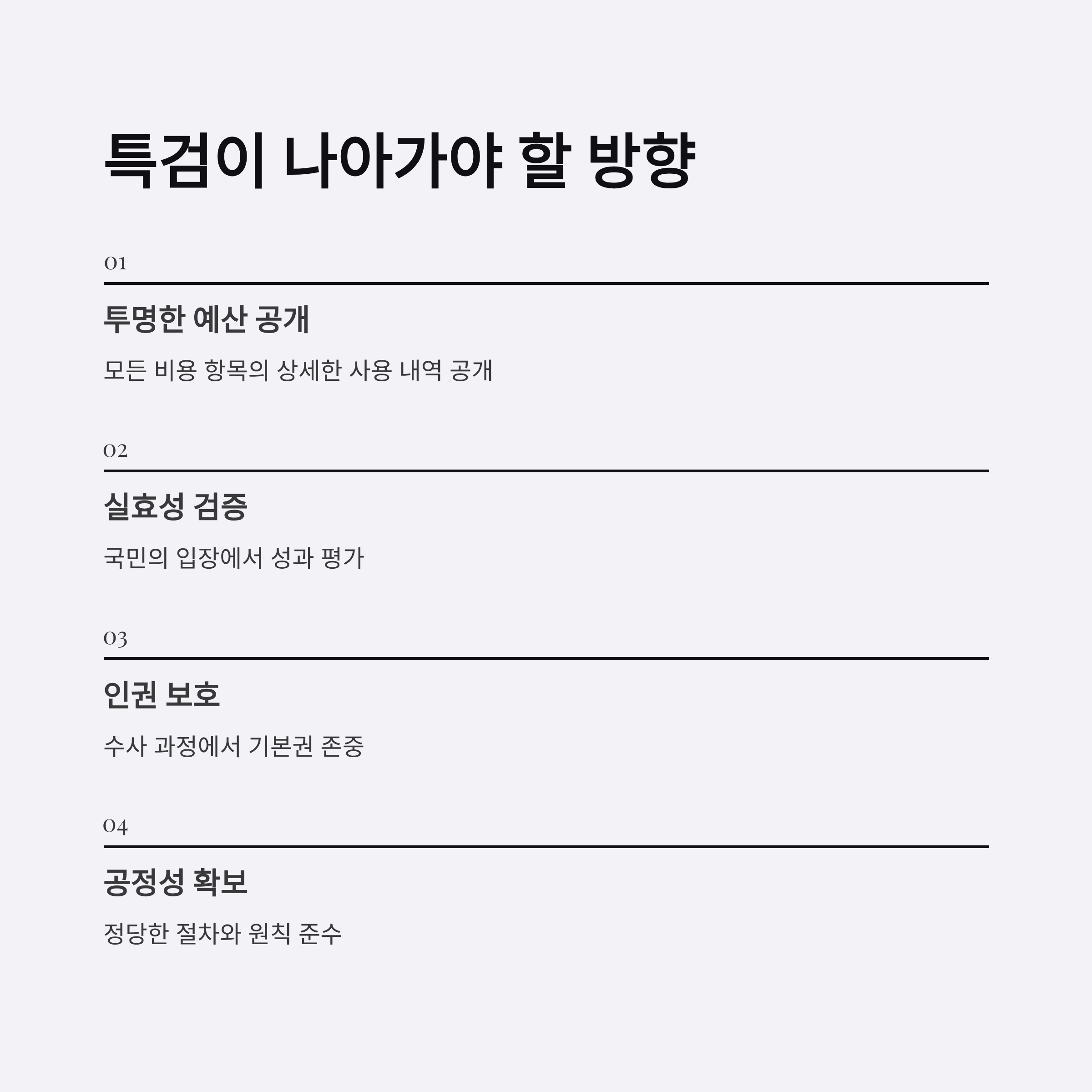 특검 활동은 국민적 신뢰 회복을 최우선 과제로 삼아야 합니다. 이를 위해 예산 집행의 투명성이 증명되고, 공정성과 효과성을 기준으로 운영 방식을 개선해야 할 것입니다. 이를 실천하지 않는다면 정치적 신뢰와 공공 이익을 위한 특검의 존재 가치는 점점 더 희미해질 것입니다.