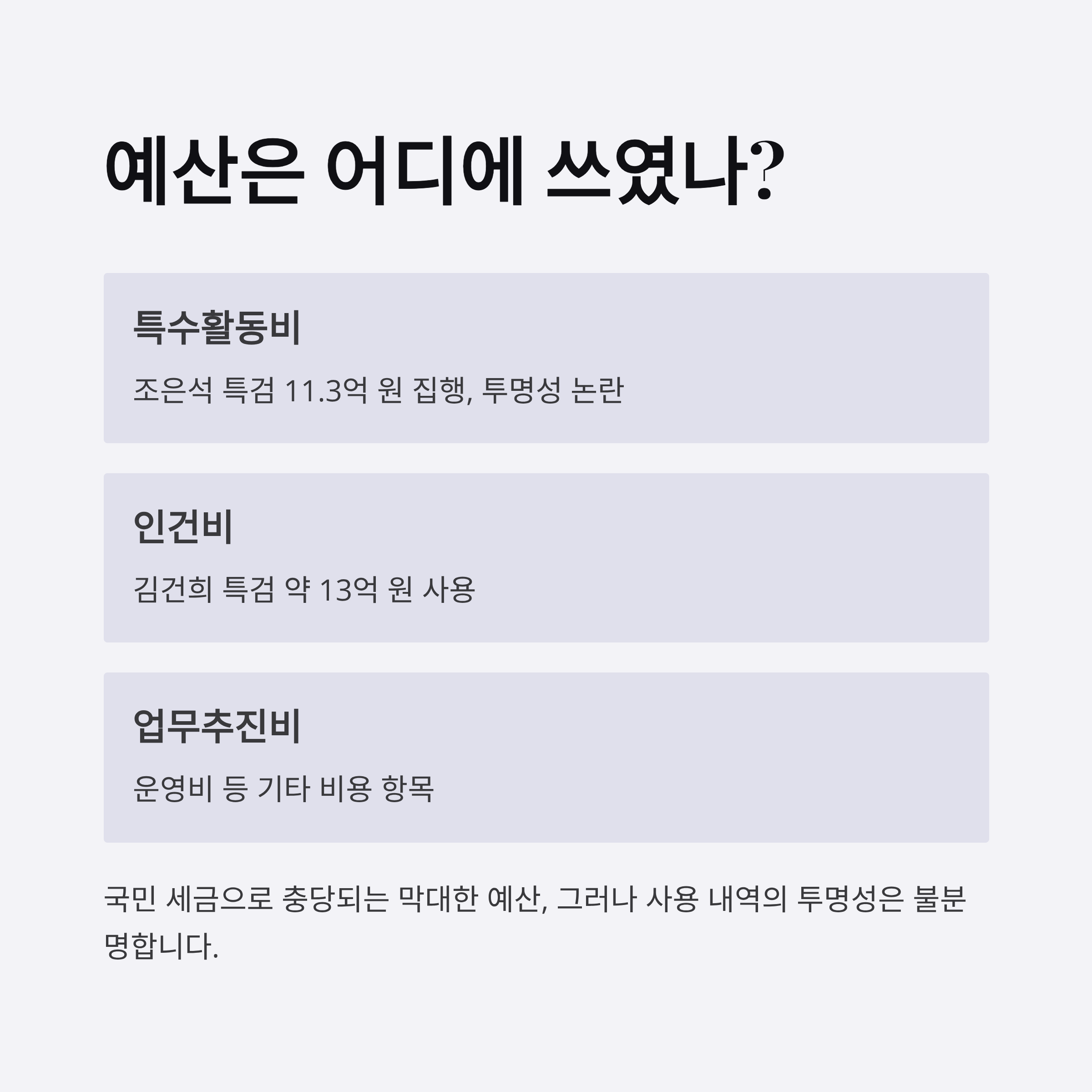 - 주요 비용 항목으로 특수활동비, 업무추진비, 인권비 등이 포함되며, 이는 투명성이 요구되는 부분입니다.