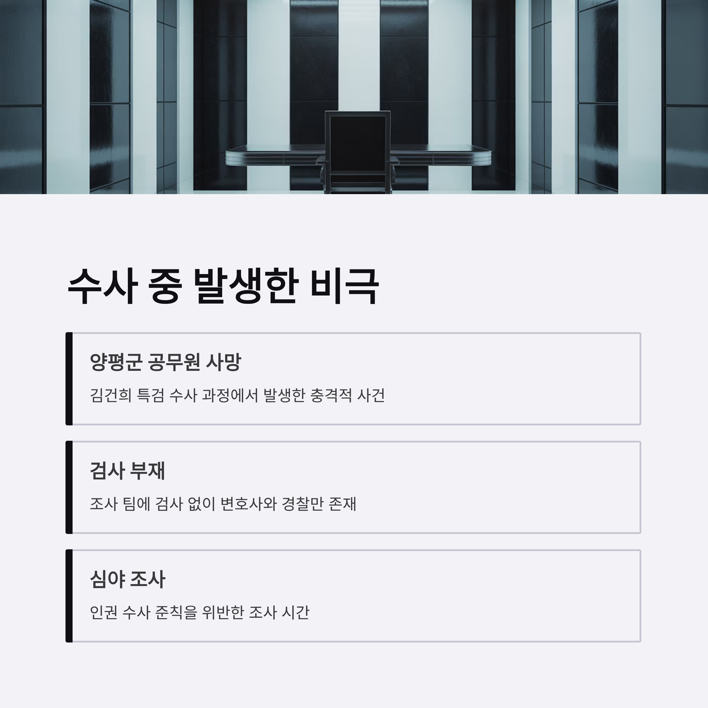 김건희 특검 조사 도중 발생한 양평군 공무원 사망 사건은 수사 절차와 인권 보호에 대한 본질적 문제를 제기합니다. 명확하지 않은 조사 시간과 팀구성의 부적절성(검사가 참여하지 않고 변호사와 경찰이 주요 조사에 임함)은 국가 기관의 절차적 정당성을 의심하게 만들었습니다. 특히 심야 조사는 인권 수사 준칙을 어길 수 있는 요소로, 국민들의 의구심을 증폭시켰습니다.