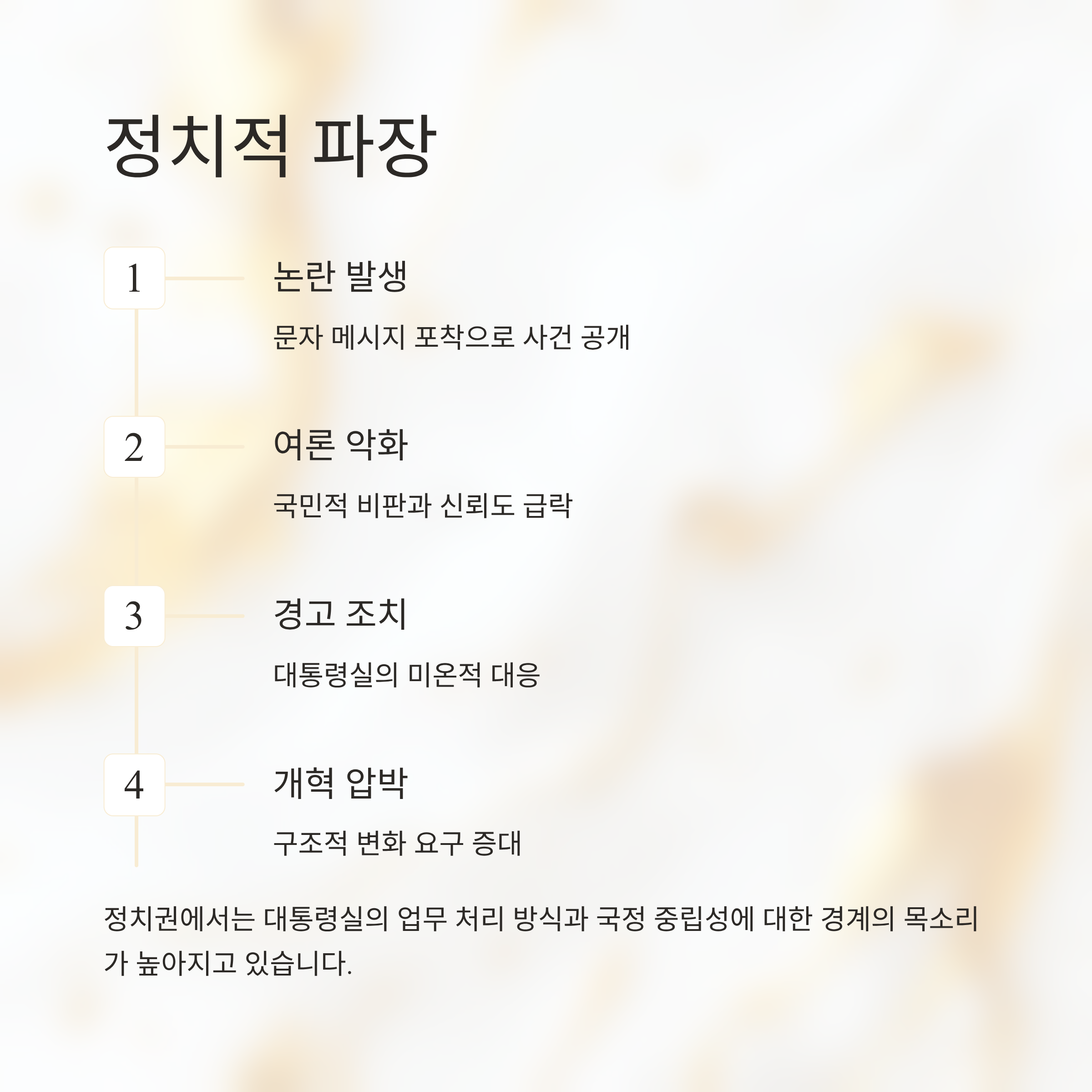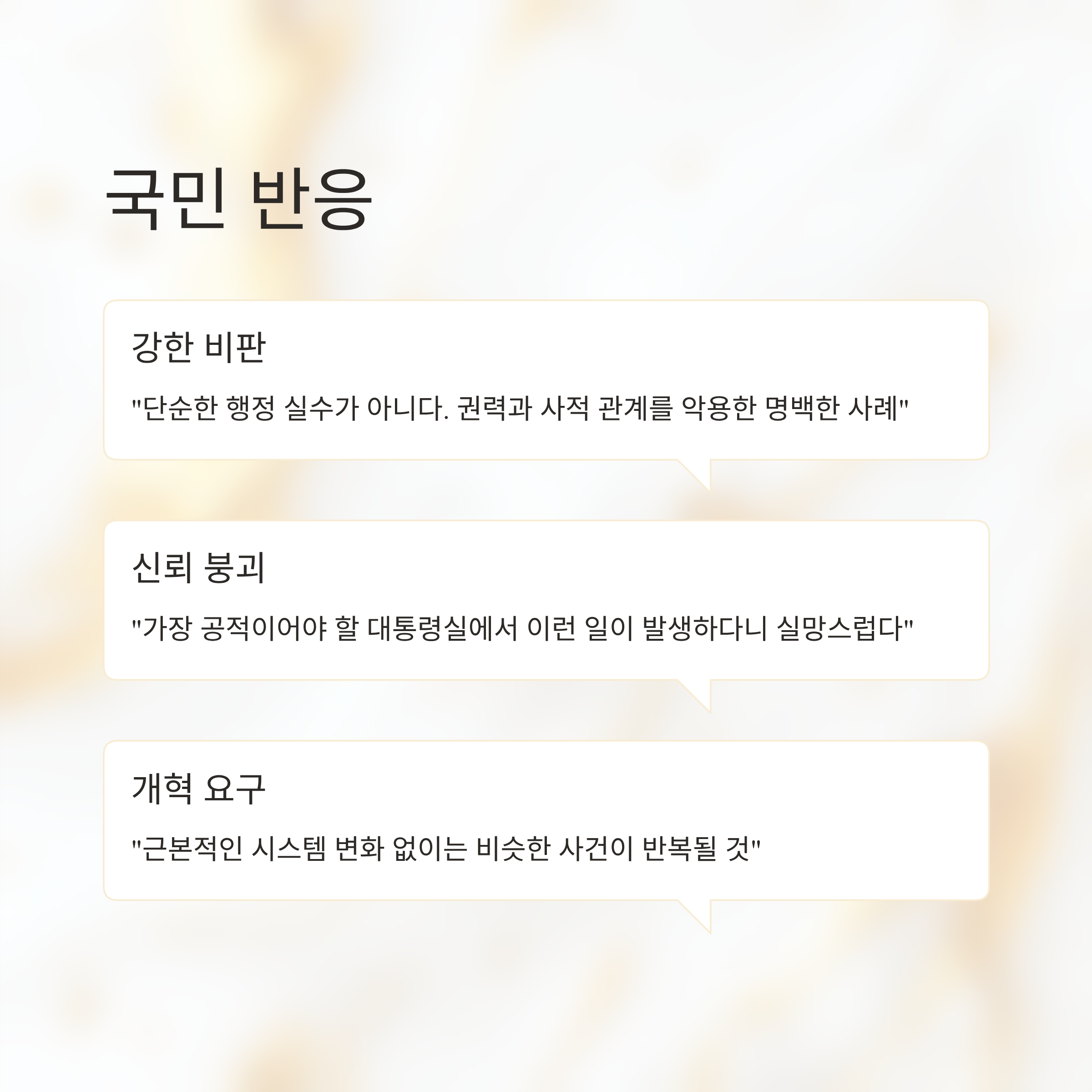 이번 사건은 조직 내부의 기강 문제가 얼마나 심각한 수준인지 보여주고 있습니다. 공적 자리의 인사 시스템이 외부의 정치적 압력이나 비공식적 네트워크에 의해 흔들릴 수 있다면, 이는 국정운영의 전체적 신뢰성을 훼손하는 결과를 초래할 수밖에 없습니다. 특히, 사건 이후 대통령실이 발표한 경고 조치조차 '관례적인 대응'으로 보이며 실질적 해결책에는 미치지 못한다는 비판을 받고 있습니다.