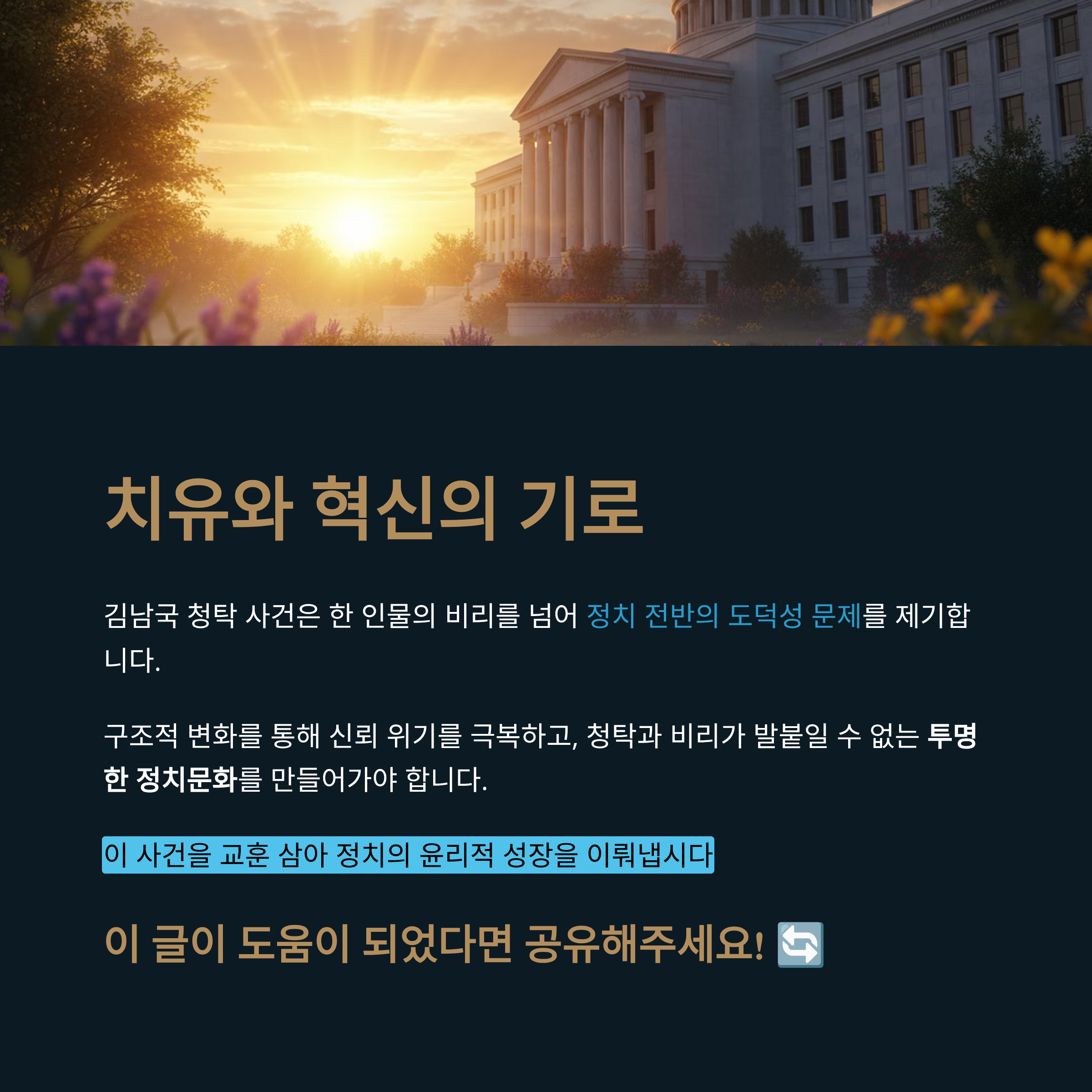 김남국 청탁 사건은 단순히 한 인물의 비리로 끝나는 것이 아니다. 이는 정치 전반에 걸친 도덕성과 원칙의 문제를 다시금 강조하며, 해당 사건으로 드러난 공직 사회와 정치권의 신뢰 위기는 제도적 변화를 통해 극복할 수 있다.