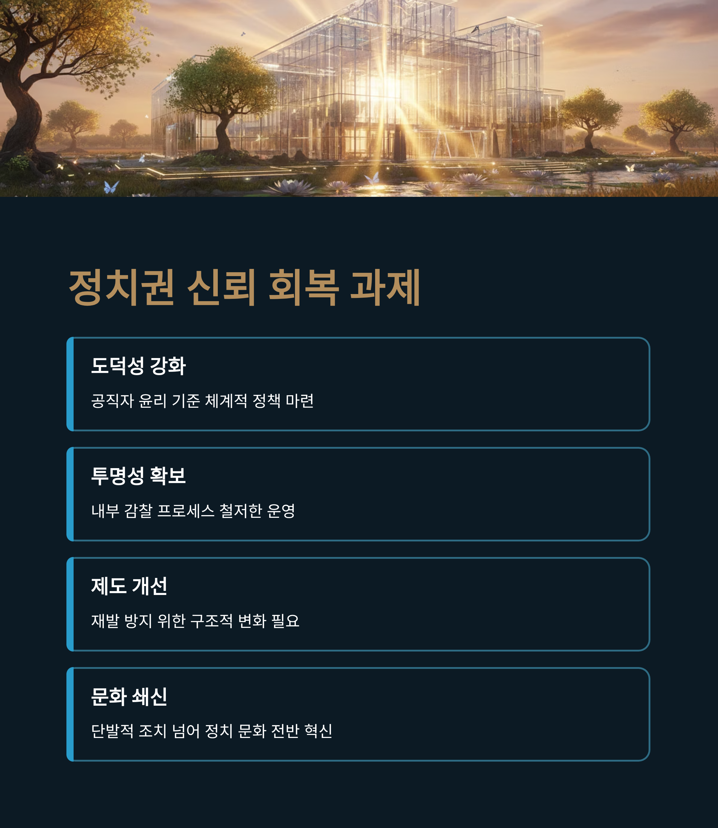 김남국 사건은 정치권이 국민 신뢰 회복을 위해 어떤 방향으로 나아가야 할지 심각하게 고민해야 함을 보여줍니다. 공직자의 도덕성과 투명성을 강화하는 체계적 정책 제안과 함께, 내부 감찰 프로세스를 좀 더 철저히 운영할 수 있어야 합니다.