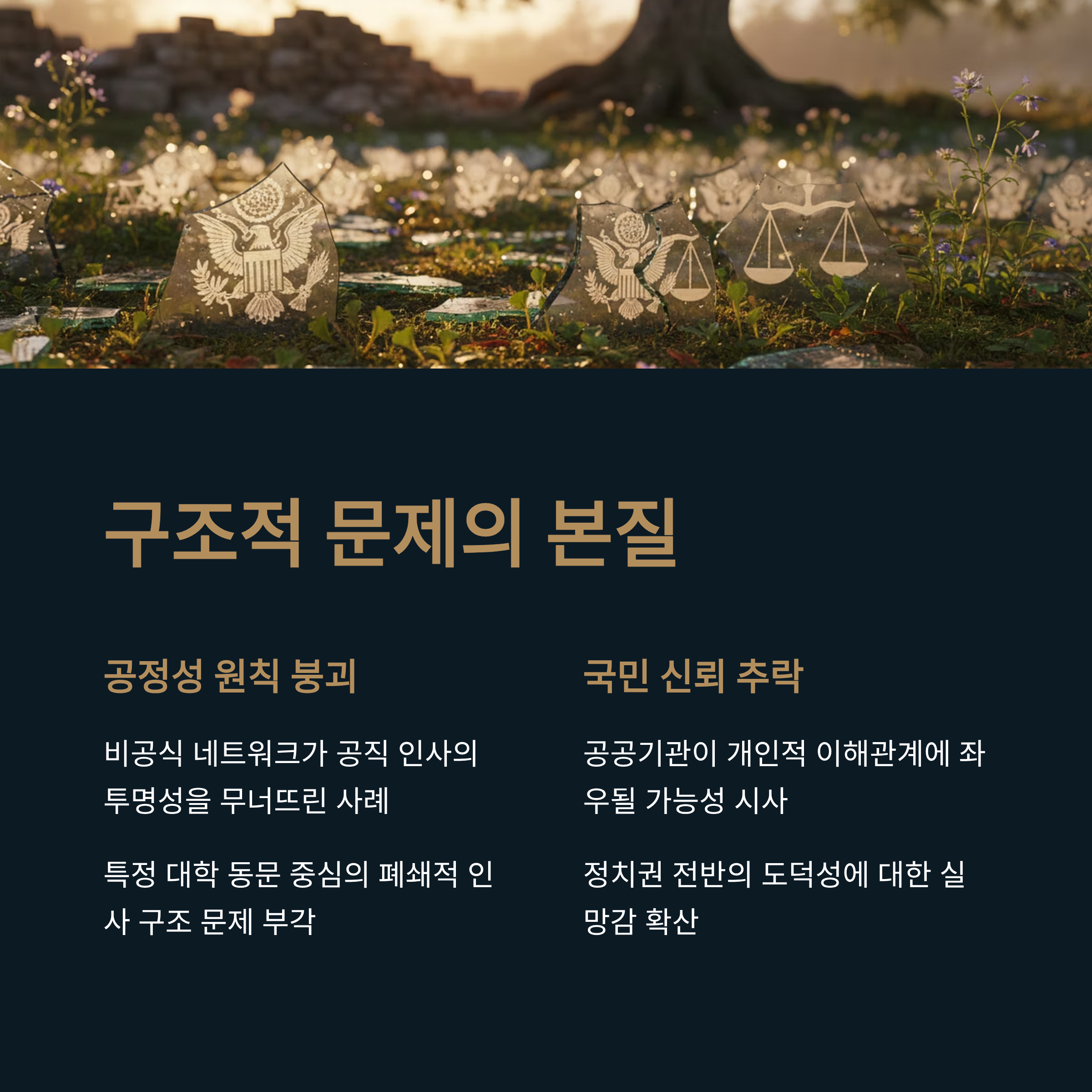 특히 중앙대 동문과 같은 특정 대학 네트워크에 의존한 사례는 인사를 둘러싼 폐쇄적 구조를 지속적으로 문제 삼아야 할 필요성을 일깨웠습니다. 이는 공정성을 기대하는 국민들에게 큰 실망을 안겼고, 정치권 전반의 신뢰 하락으로 이어졌습니다.