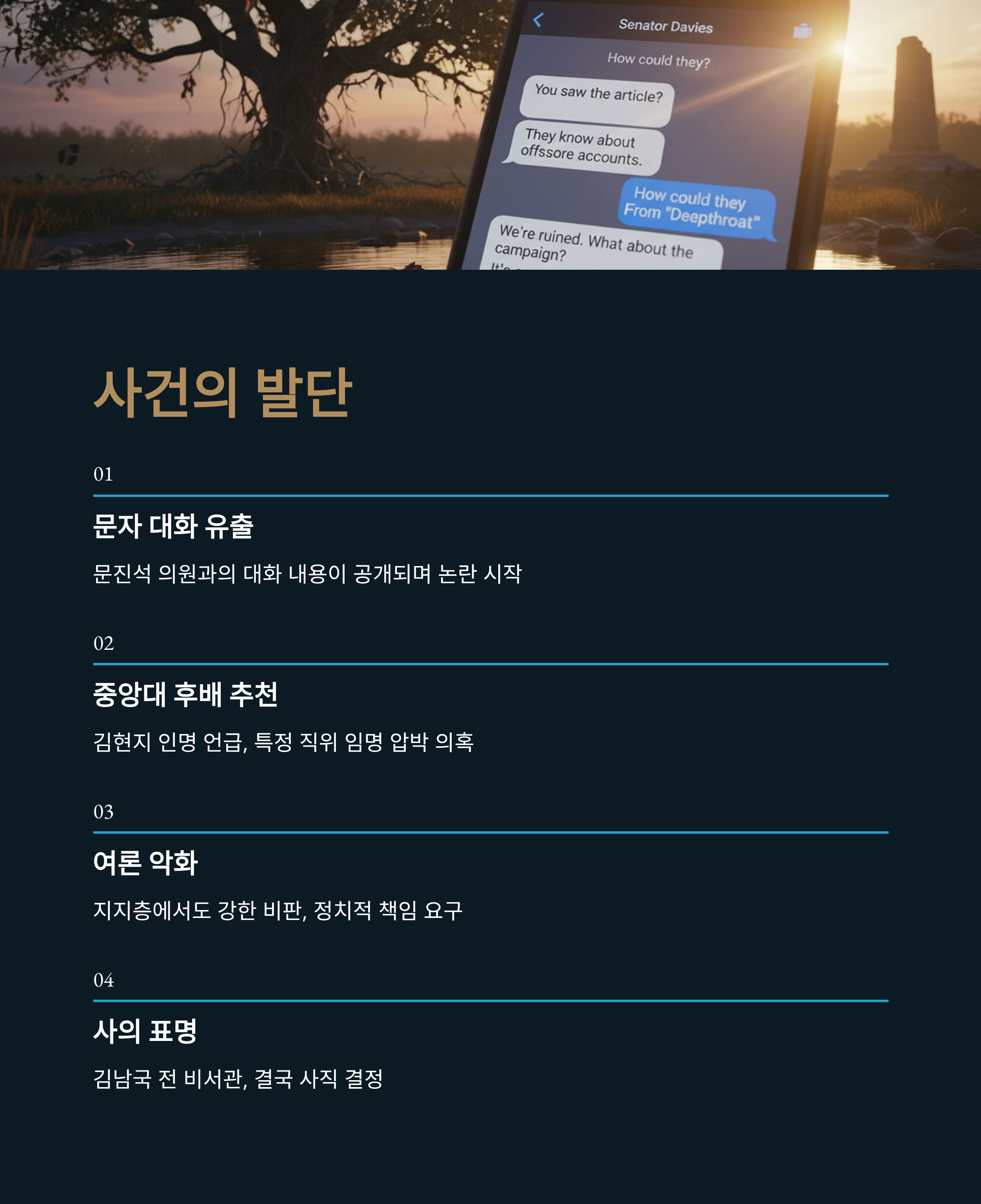 김남국 전 비서관의 인사 청탁 논란은 대한민국 정치계를 강타하며, 공직 사회의 윤리적 문제를 지적하는 대표 사례로 떠올랐습니다. 문진석 의원과의 문자 대화가 공개되면서 중앙대학교 출신 후배를 특정 직위에 추천 혹은 압박하여 임명하려 했다는 의혹이 외부에 알려진 것입니다. 이는 그동안 쌓여온 정권 내 신뢰 문제와 맞물리며, 대통령실의 도덕성 논란으로까지 이어지는 상황을 만들었습니다.