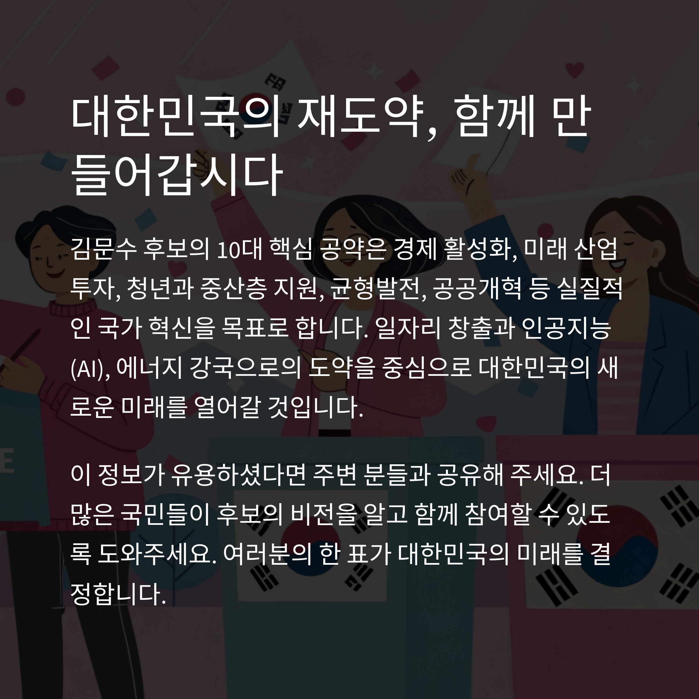 김문수 대통령 후보는 대한민국의 재도약을 위한 10대 핵심 공약을 발표했습니다. 이번 공약은 경제 활성화, 미래 산업 투자, 청년과 중산층 지원, 균형발전, 공공개혁 등 실질적인 국가 혁신을 목표로 하고 있습니다. 특히, 일자리 창출과 인공지능(AI), 에너지 강국으로의 도약을 중심으로 실현 가능성과 추진력을 강조하고 있습니다.