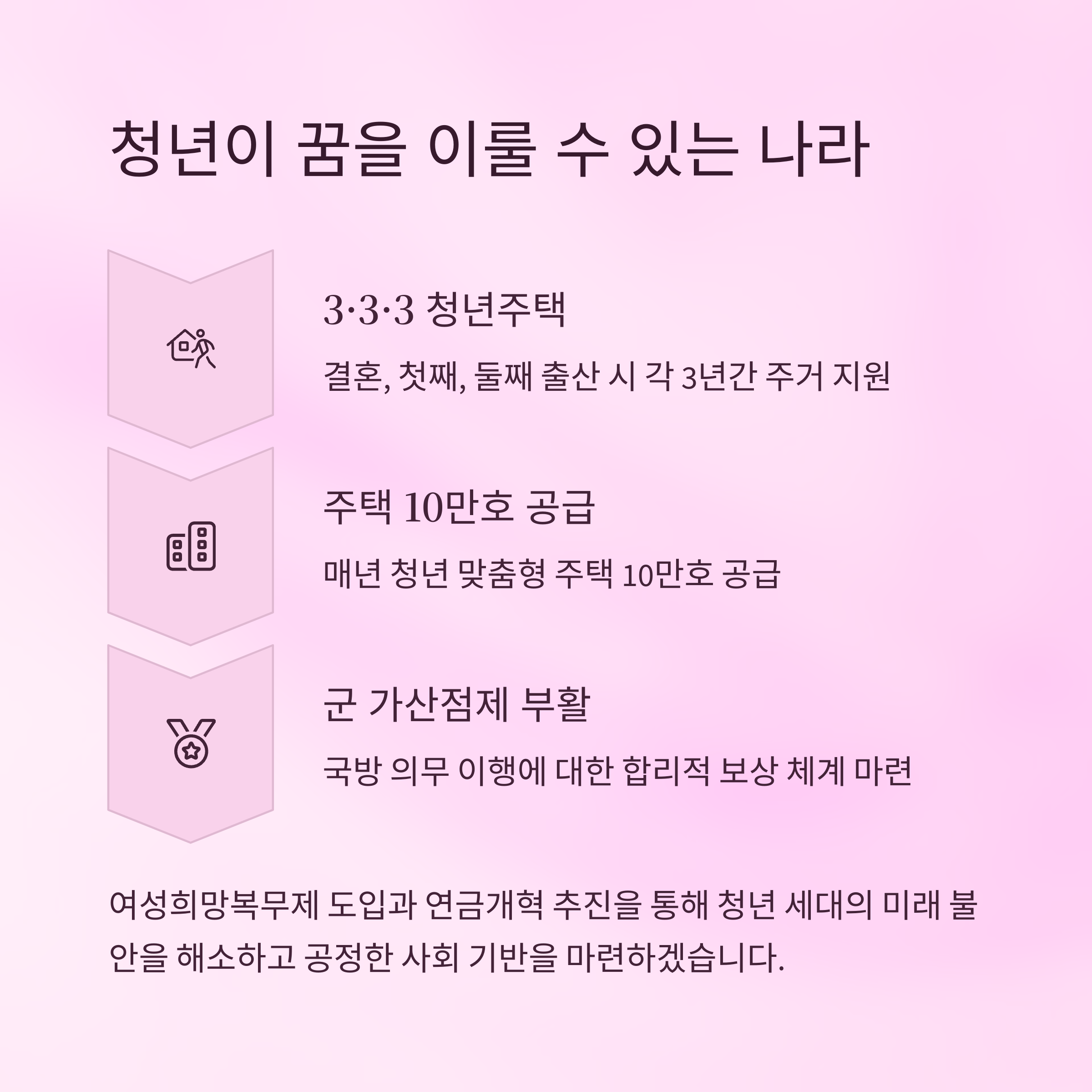- 청년주택 매년 10만 호 공급, 군 가산점제 부활
