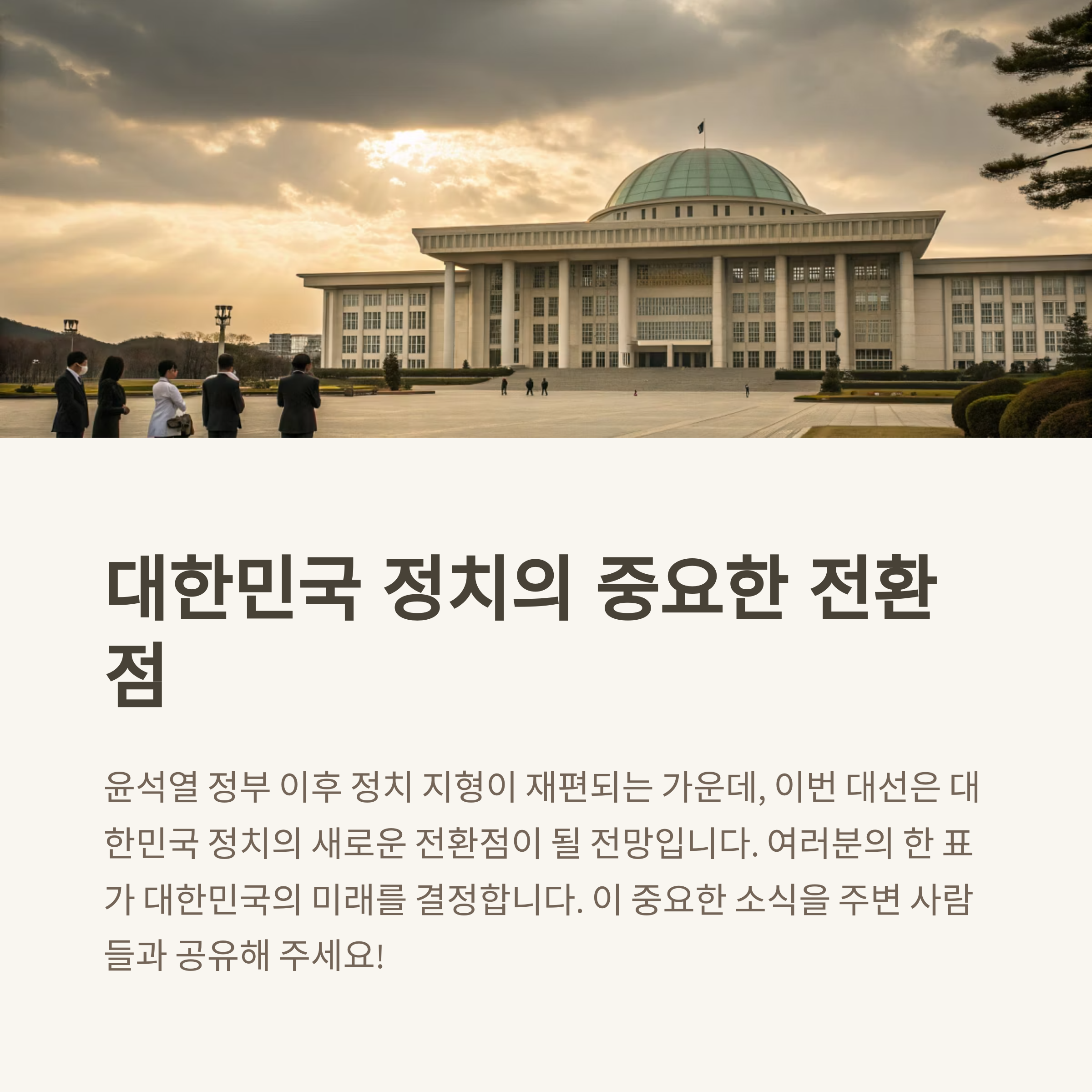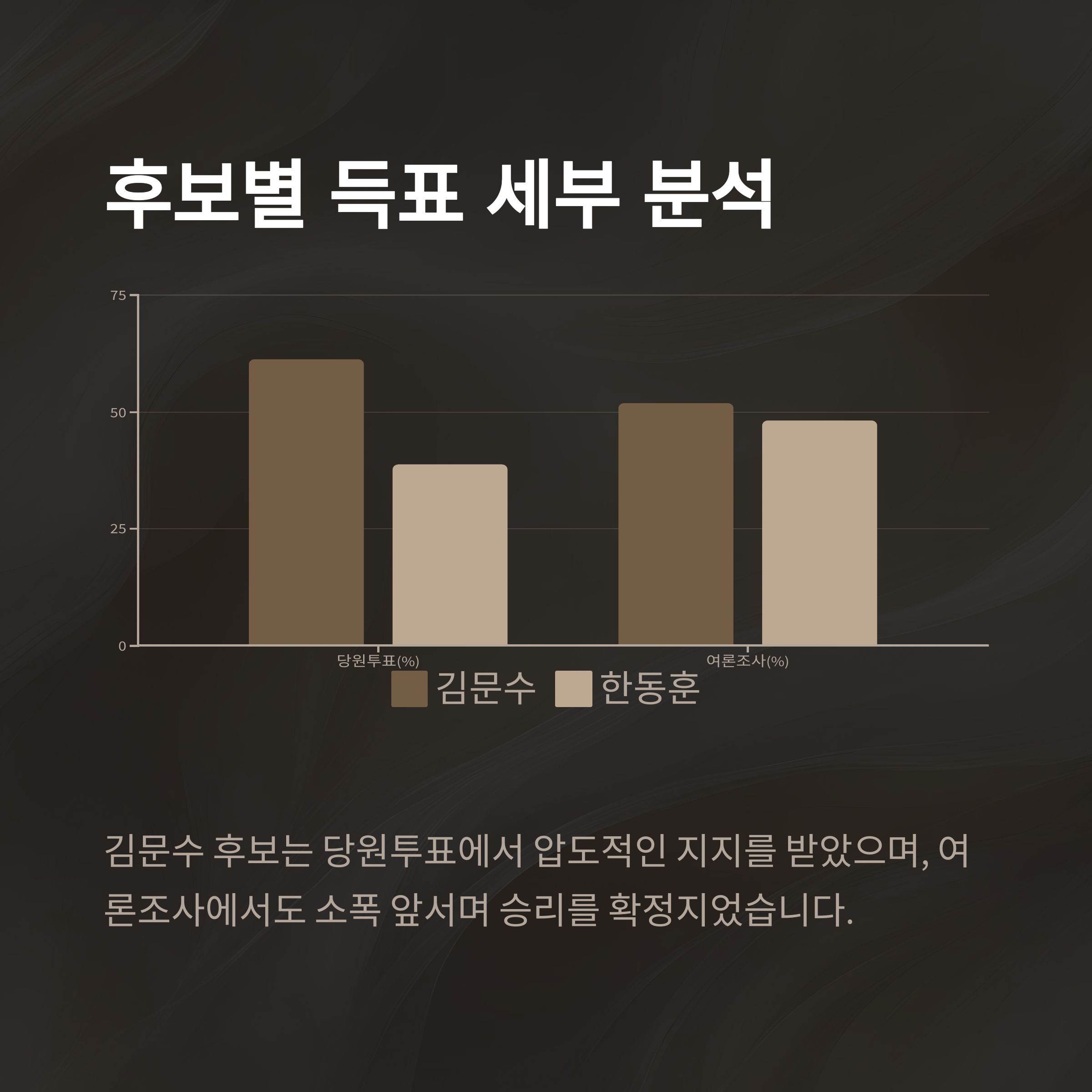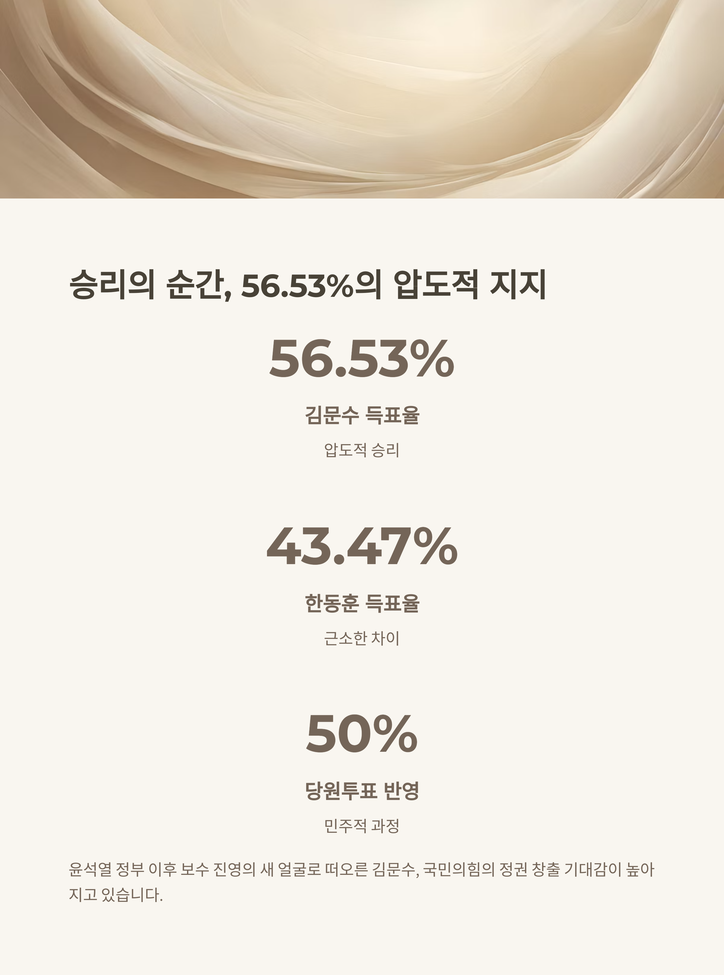 56.53%라는 득표율은 상대적으로 안정적인 과반수지만 압도적이라고 보기는 어렵습니다. 이는 보수 중심층에서의 고른 지지 기반이 형성된 반면, 국민 여론에서는 여전히 한동훈 후보에 대한 지지도 다소 존재했음을 나타냅니다. 따라서 김문수 후보의 향후 과제는 보수 외연 확장과 새로운 정책 비전 제시가 될 것입니다.