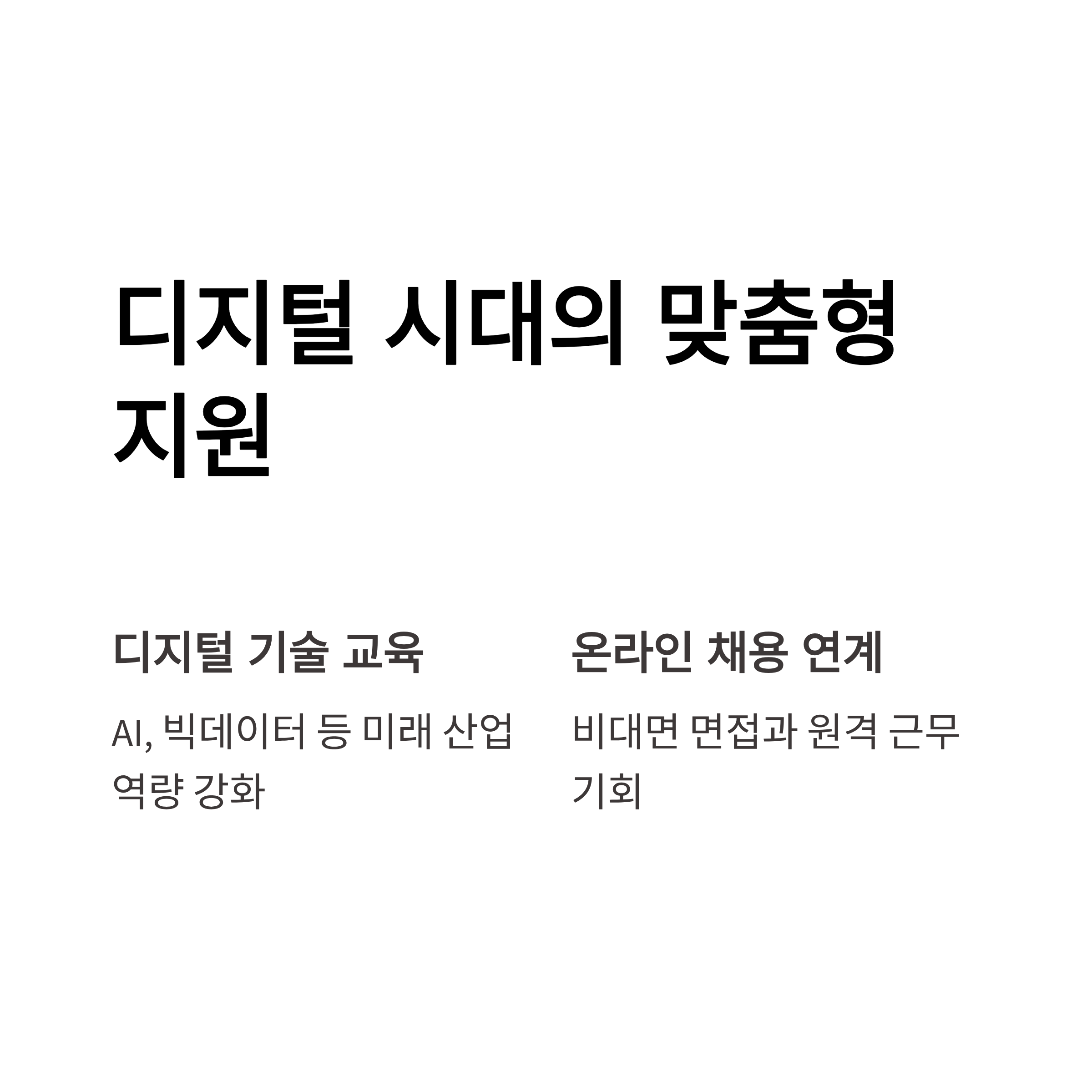 | A. 현장 채용 기회는 물론, 이력서 리뷰, 전문 상담, 디지털 기술 관련 프로그램 등을 통해 개인 역량을 발전시킬 수 있는 다양한 혜택이 제공됩니다. |
