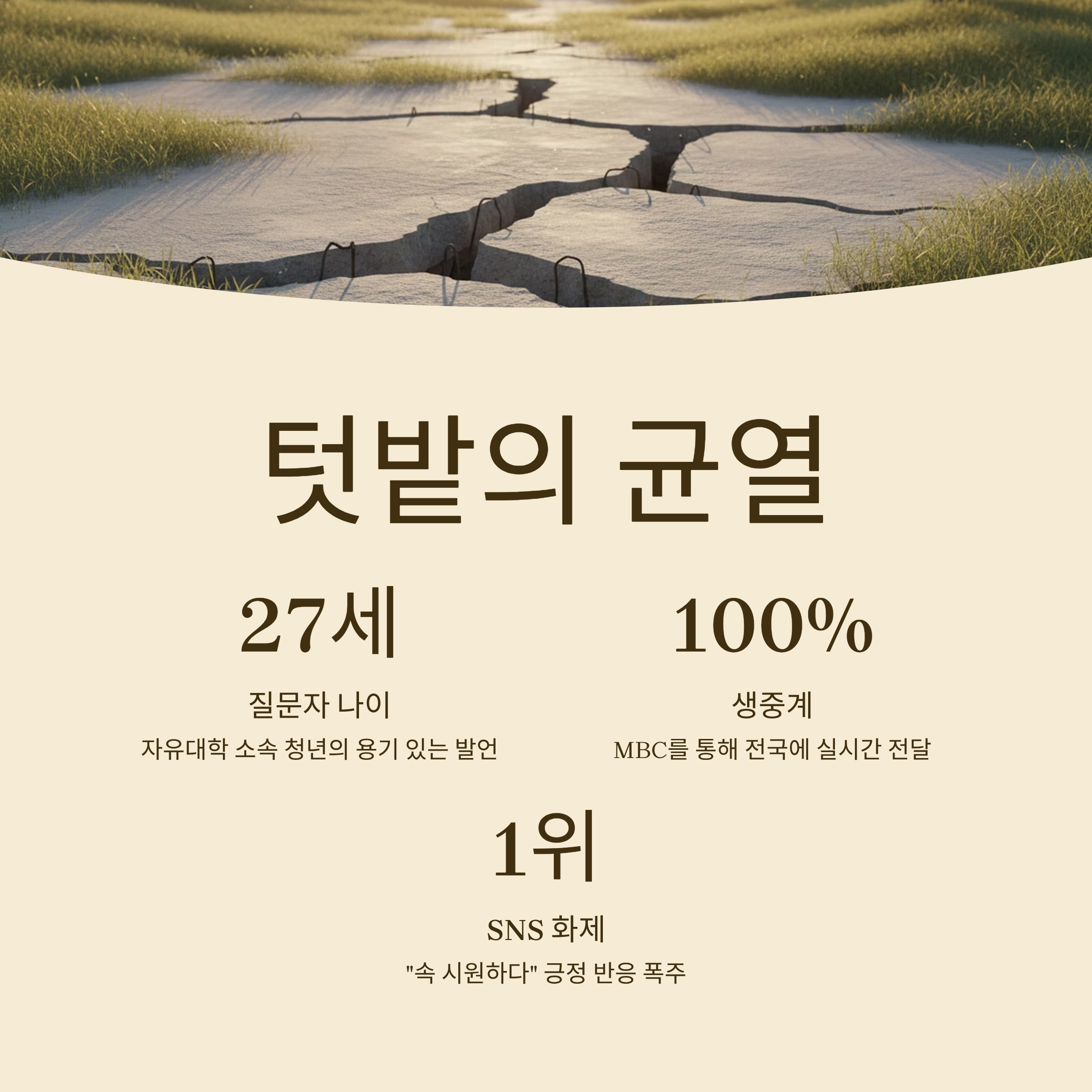 | A. 이번 사건은 민주당의 정치적 텃밭인 전라북도 전주, 그중에서도 국립대인 전북대학교에서 발생했습니다. 통상적으로 여권에 우호적인 반응이 예상되는 곳에서 정권의 핵심 정책을 비판하는 목소리가 터져 나왔고, 이것이 MBC 생중계를 통해 전국에 전달되었다는 점에서 '안방의 반란'이자 민심 변화의 신호탄으로 해석됩니다. |