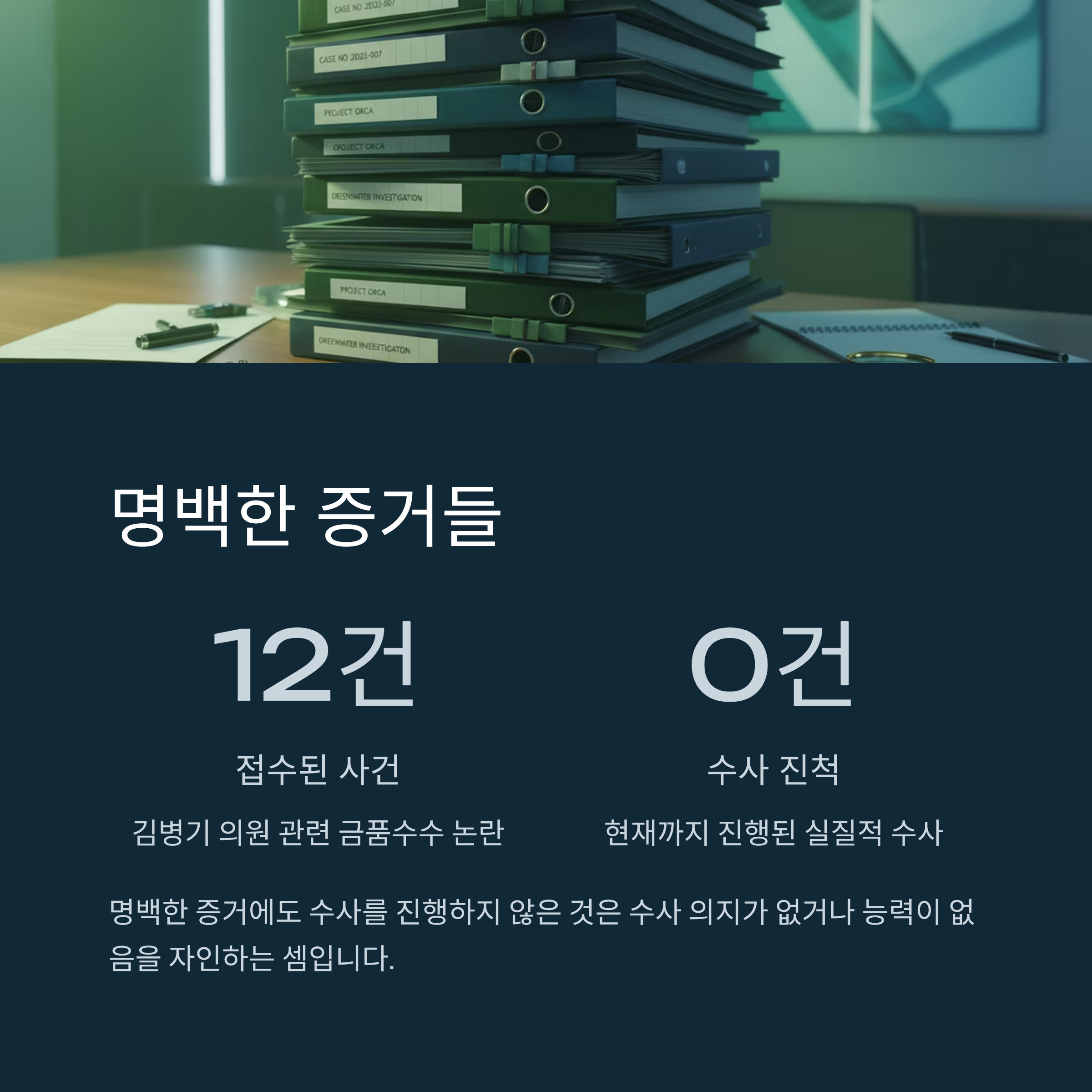공천헌금 의혹 자체에 대해서도 마찬가지입니다. 과거 이수진 전 의원이 문제를 제기하고, 김 의원의 전 보좌진들이 구체적인 진술서와 탄원서를 경찰에 제출했음에도, 경찰은 이를 수사 요청으로 판단하지 않았다며 한 달 넘게 사건 배당조차 하지 않았습니다. 비리 사실이 담긴 탄원서를 받고도 수사 대상인지 몰랐다는 경찰의 해명은 상식적으로 납득하기 어렵습니다. 현재까지 김 의원 관련 금품수수 논란으로 접수된 사건만 12건이 넘지만, 수사는 전혀 진척이 없는 상황입니다.