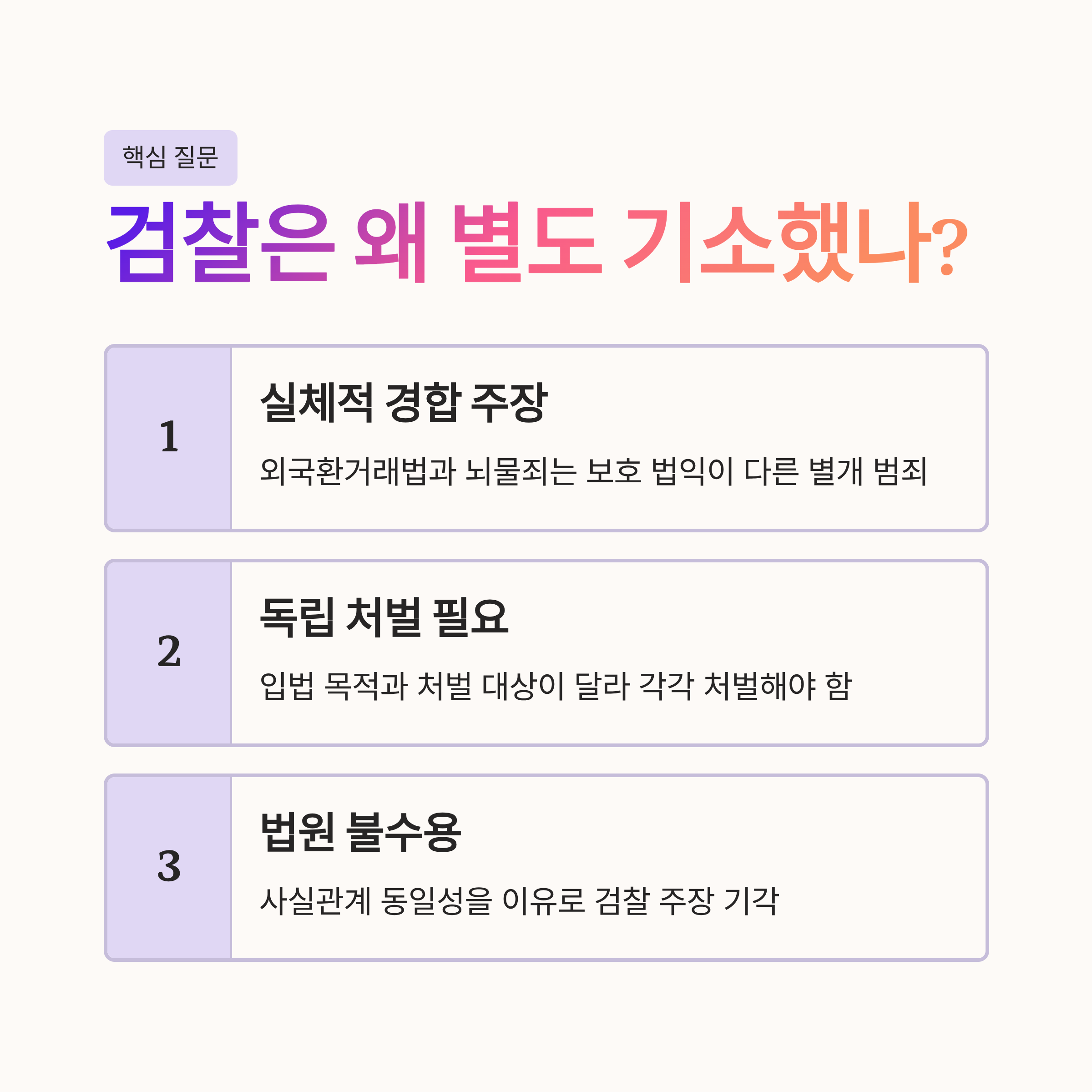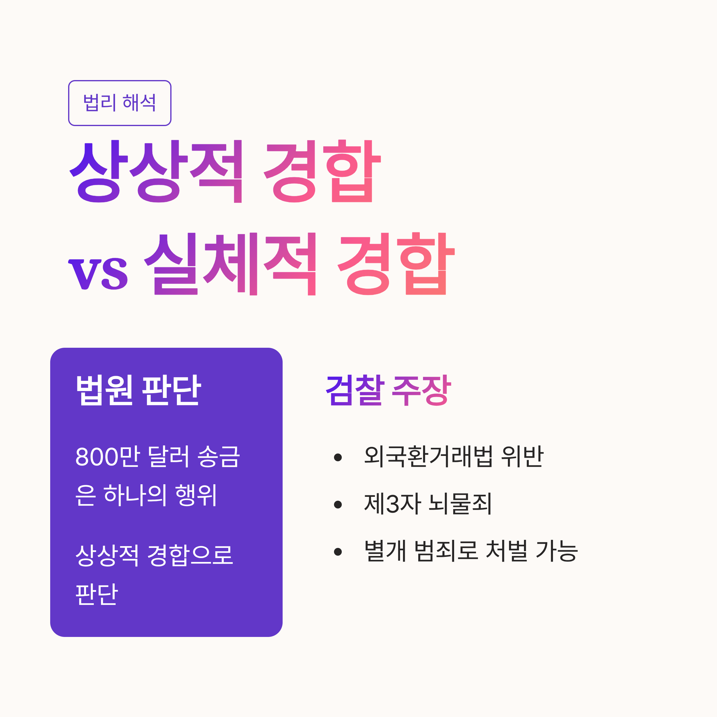 | A. 검찰은 외국환거래법 위반(불법 송금)과 뇌물 공여(대가성 청탁)는 서로 다른 법적 보호 이익을 가진 별개의 범죄라고 판단했습니다. 이를 '실체적 경합'이라고 하는데, 검찰은 입법 목적과 처벌 대상이 다르므로 각각 독립된 범죄로 처벌해야 한다고 주장했으나, 재판부는 사실관계가 동일하다는 점을 들어 이를 받아들이지 않았습니다. |