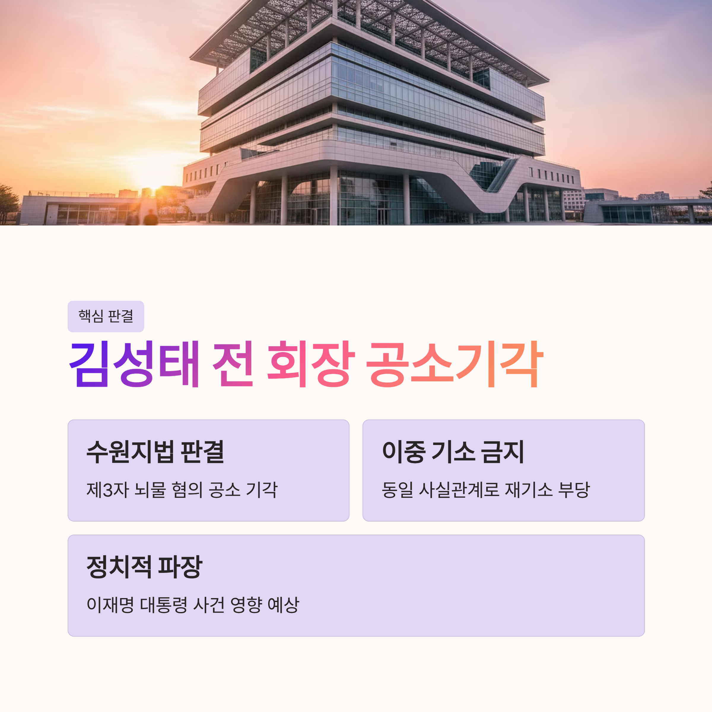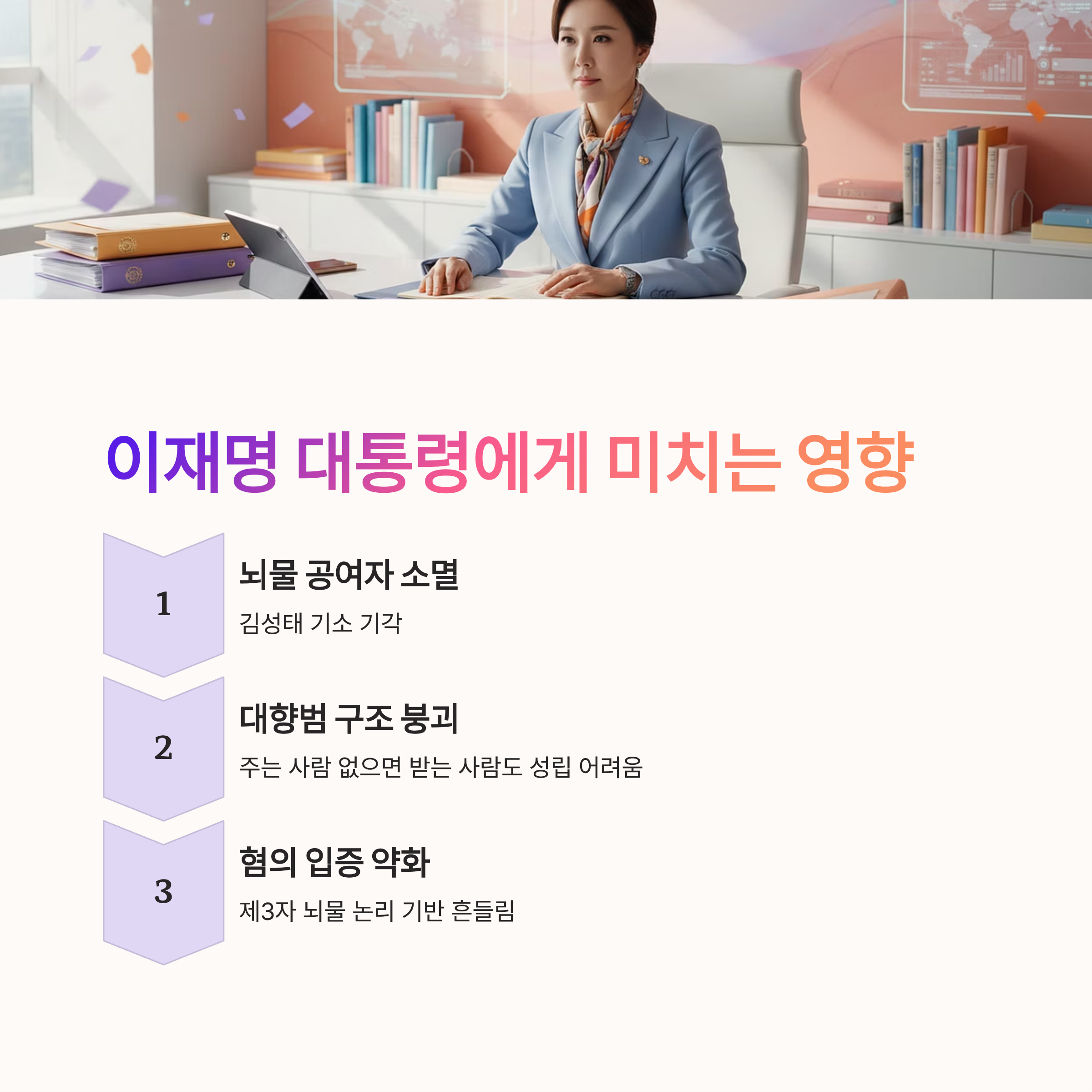 이번 판결로 뇌물 공여자가 사라져, 이재명 대통령의 제3자 뇌물 혐의 입증이 어려워질 전망입니다.