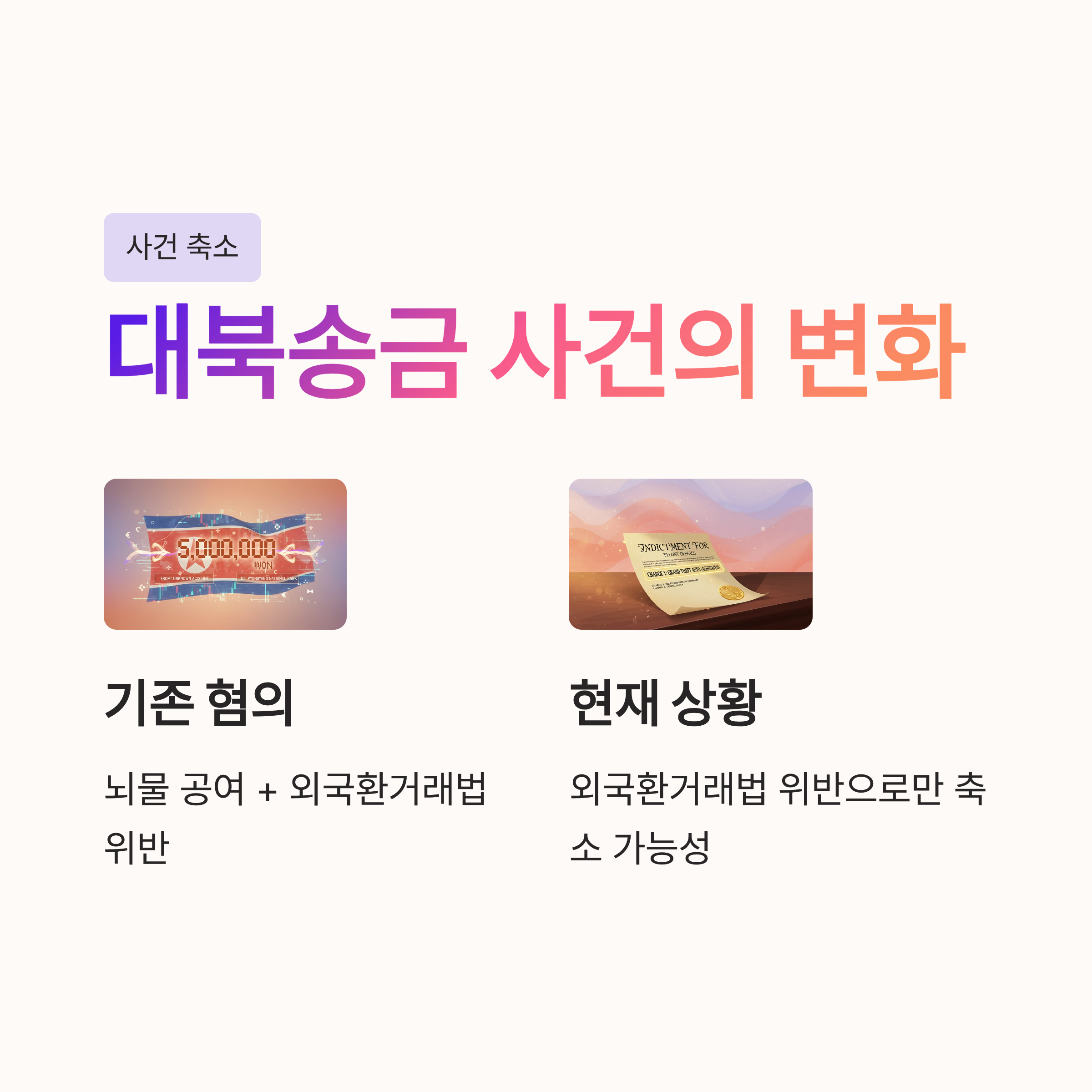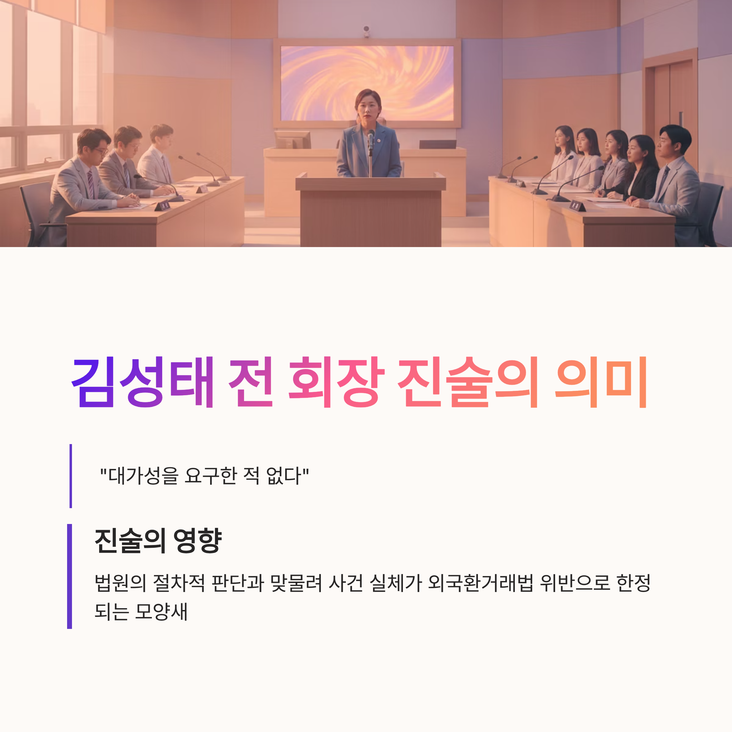 이번 사건에서 가장 큰 쟁점은 김성태 전 회장이 북한 측(조선노동당, 리호남 등)에 돈을 건넨 행위를 어떻게 해석하느냐였습니다. 검찰은 외국환거래법 위반과 뇌물 공여는 입법 목적과 보호 법익이 다른 '실체적 경합(별개의 범죄)'이라고 주장했습니다. 그러나 재판부는 돈을 건넨 행위 자체는 하나이며, 비록 명목상의 수령인이 다소 차이가 있더라도 실질적으로는 동일한 행위라고 판단했습니다. 이는 검찰이 피고인을 압박하기 위해 사건을 쪼개서 기소하는 관행에 제동을 건 것으로, 피고인의 방어권 보장을 우선시한 판결로 해석됩니다. 김 전 회장이 이미 1심에서 징역형을 선고받고 항소심 중인 상황에서 추가적인 재판 부담을 지우는 것은 가혹하다는 취지입니다.