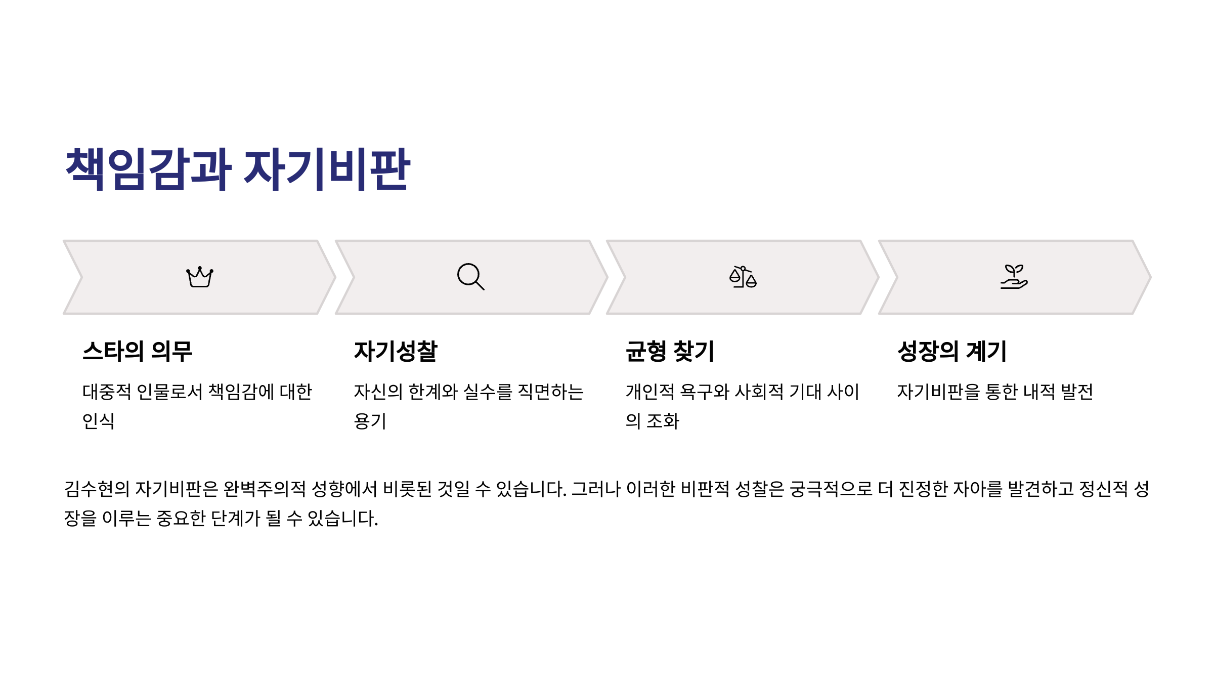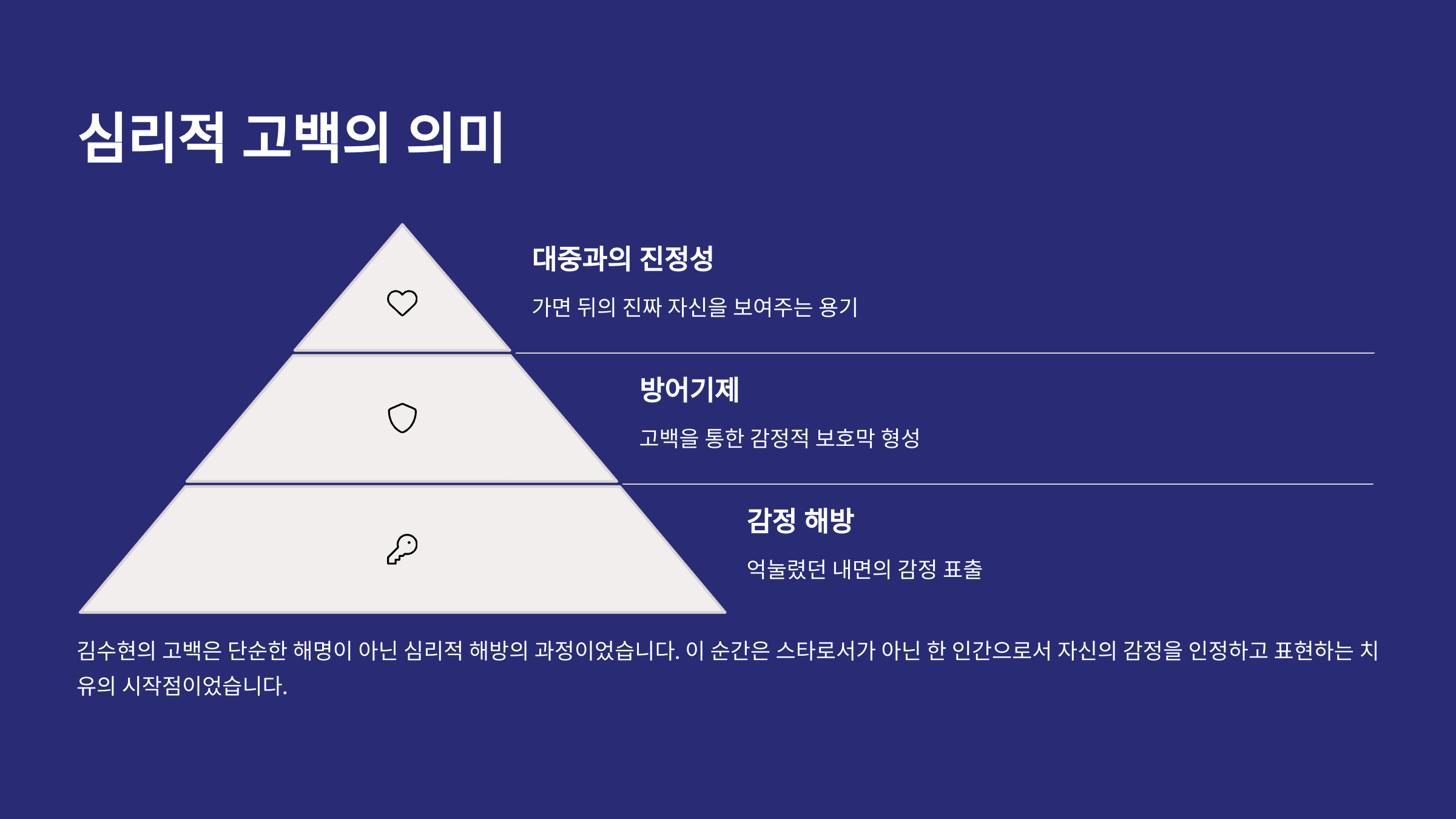 | 자아 분리 | 스타로서의 역할과 인간으로서 감정 사이의 갈등 | “스타 김수현으로서 선택을 했다”, “지켜야 할 게 너무 많았다” |