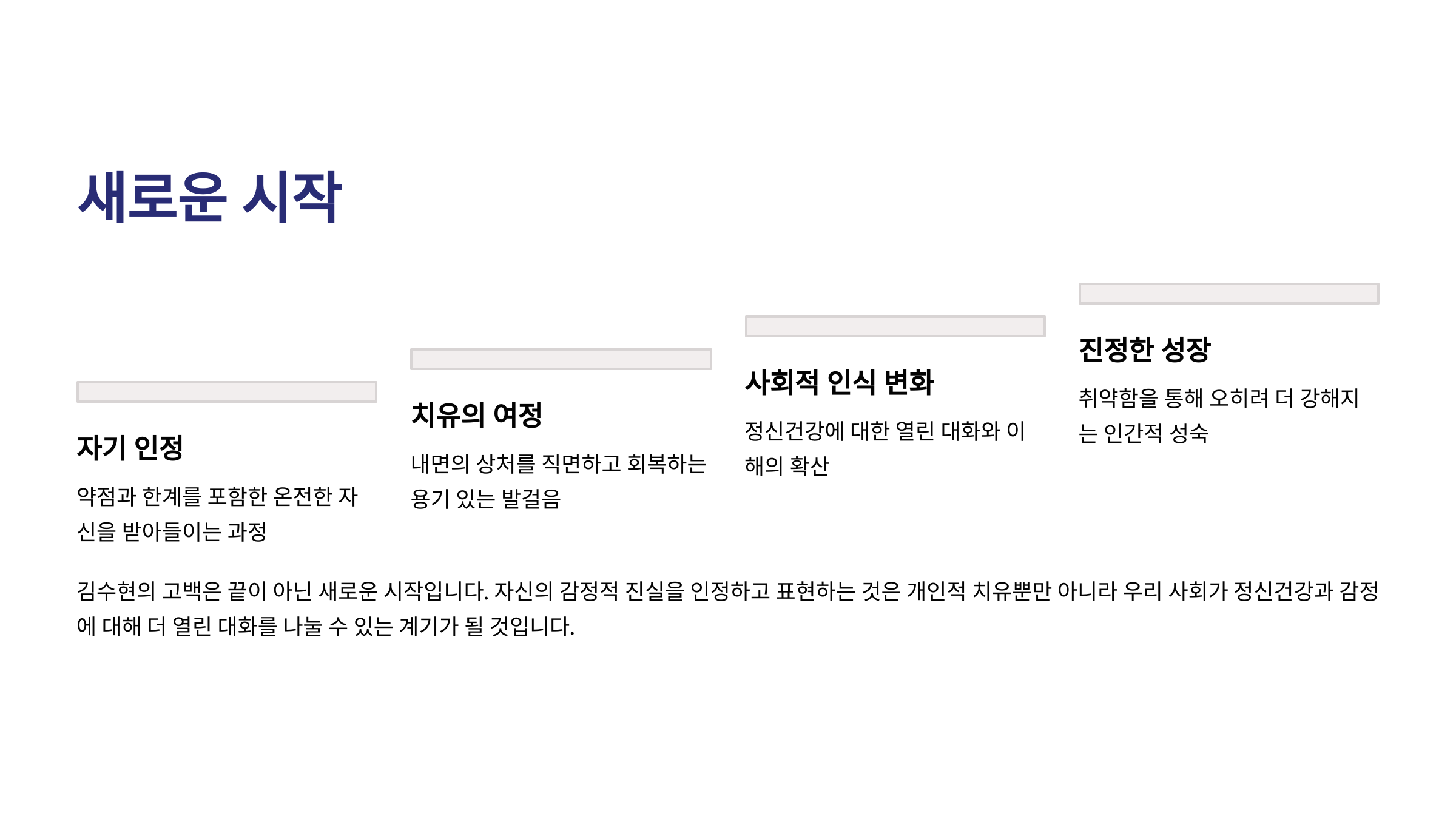 “스타 김수현으로서의 선택을 해 왔다.” 이 말은 곧 ‘인간 김수현’의 희생을 의미합니다. 그는 배우로서 작품과 브랜드 이미지, 공동체 책임을 이유로 자기 감정을 억누르는 삶을 살았습니다. 이런 자아의 분리는 시간이 갈수록 감정 마비(emotional numbing) 또는 정체성 혼란으로 이어질 수 있으며, 진정한 ‘자기’가 무엇인지 잃게 만듭니다. 이런 상태에서는 공감 능력도 점점 둔화되며 우울과 무기력에 빠지기 쉽습니다.