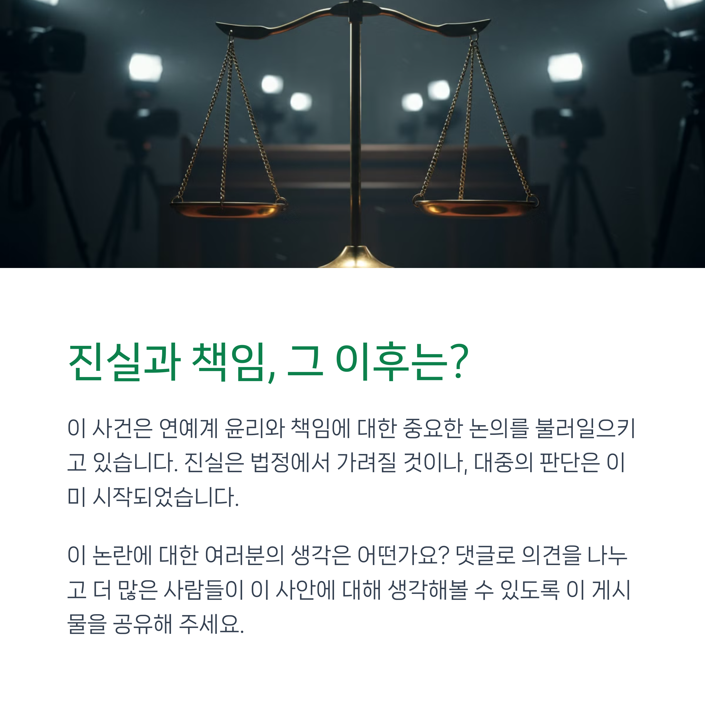 김수현의 기자회견은 단순한 해명을 넘어, 연예계에서 공인이 어떤 방식으로 위기를 관리하는지를 보여주는 중요한 사례가 되었습니다. 그는 감정적으로 격앙된 모습과 함께 법적 증거를 제시했지만, 여전히 대중의 신뢰를 완전히 회복하지는 못하고 있습니다. 이번 사건은 진실 여부에 따라 매우 다른 결과를 낳게 될 것입니다. 김수현이 결백하다는 법적 판단이 내려진다면, 그에 대한 비난은 동정과 지지로 바뀔 가능성이 큽니다. 그는 억울하게 희생된 스타로 이미지가 재구성되며, 새로운 기회를 얻을 수 있을 것입니다. 반면, 거짓이 드러날 경우 그는 단순한 연예계 논란의 주인공이 아닌, 공인으로서의 책임과 도덕성을 저버린 인물로 낙인찍힐 수 있습니다. 무엇보다 중요한 것은, 이번 사건이 연예계 전반에 걸쳐 미성년자 보호, 증거의 진위 판단, 허위 정보 유포에 대한 법적 기준을 다시금 점검하는 계기가 되어야 한다는 점입니다. 단순한 스캔들을 넘어서, 사회 전반의 인식 변화를 이끌어낼 수 있는 중요한 분기점이 될 수 있습니다.