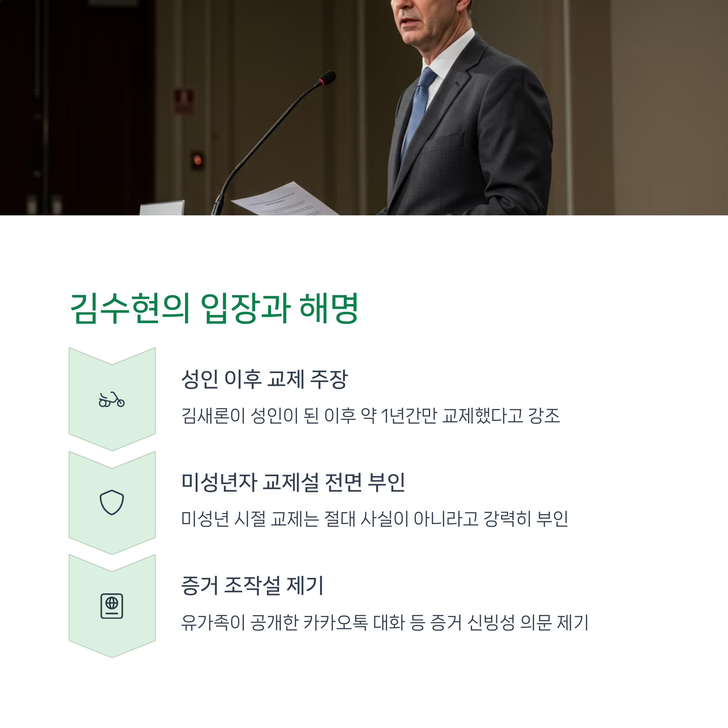 김수현은 고 김새론과의 교제 사실을 인정하면서도, 그 시점이 김새론이 성인이 된 이후라고 강조했습니다. 그는 미성년자 시절 교제 의혹은 사실이 아니라고 강하게 부인하며, 유족 측이 공개한 카카오톡 대화와 증거들이 조작되었을 가능성을 제기했습니다. 또한, 고인이 소속사의 채무 압박으로 극단적인 선택을 했다는 주장에 대해서도 통화 녹음 파일을 공개하며 반박했습니다. 특히 그는 유족 측, 그리고 유튜브 채널 '가세연'을 상대로 120억 원 규모의 명예훼손 및 손해배상 소송을 제기했으며, 이 사건을 통해 "하지 않은 것은 하지 않은 것"이라는 단호한 메시지를 던졌습니다. 하지만, 대중은 그의 해명과 증거에도 여전히 의심의 눈초리를 거두지 않고 있으며, 기자회견 이후에도 새로운 의혹과 반론이 잇따르고 있는 상황입니다.