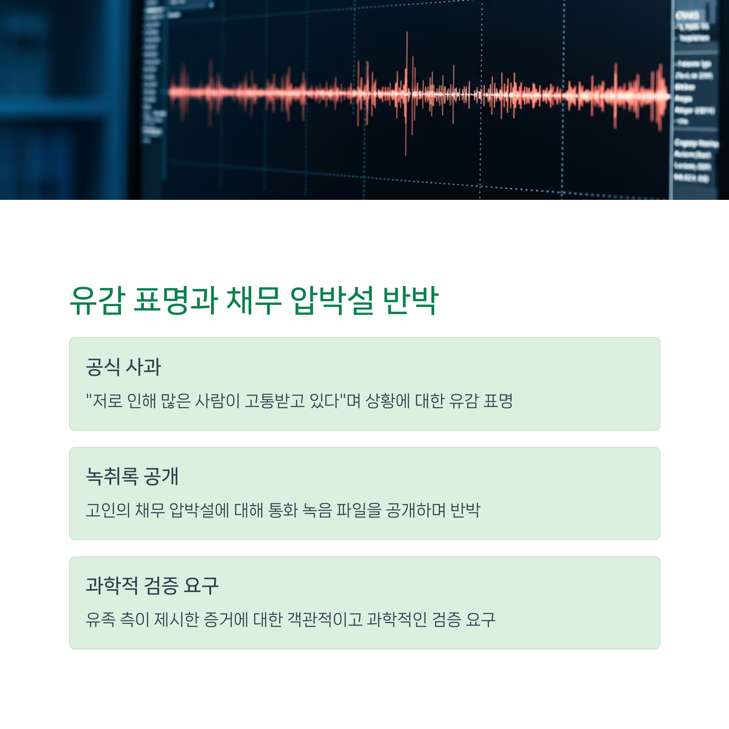 김수현은 법률대리인을 통해 유족 및 가세연을 상대로 민·형사 소송을 제기하며 적극적인 대응에 나섰습니다. 그가 제시한 주요 증거는 크게 세 가지로 나뉩니다. 첫째, 유족 측이 공개한 카카오톡 메시지가 동일 인물이 보낸 것이 아니며, 일부는 대화 패턴이 일치하지 않는다는 분석 결과입니다. 둘째, 고인의 소속사와의 통화 녹음을 통해 '채무 압박' 주장이 사실무근이라는 점을 강조했습니다. 셋째, 사건의 시간대와 관련된 오류를 지적하며, 유족 측의 주장이 허위일 가능성을 제기했습니다. 하지만 유족과 가세연은 김수현의 주장이 오히려 거짓이며, 곧 결정적인 영상과 자료를 추가로 공개하겠다고 맞서고 있습니다. 결국 이 사건의 진실은 법정에서의 증거 제출과 수사기관의 판단을 통해 드러날 수밖에 없으며, 법적 판단이 사회적 판단으로 이어지는 전례가 될 수 있습니다.