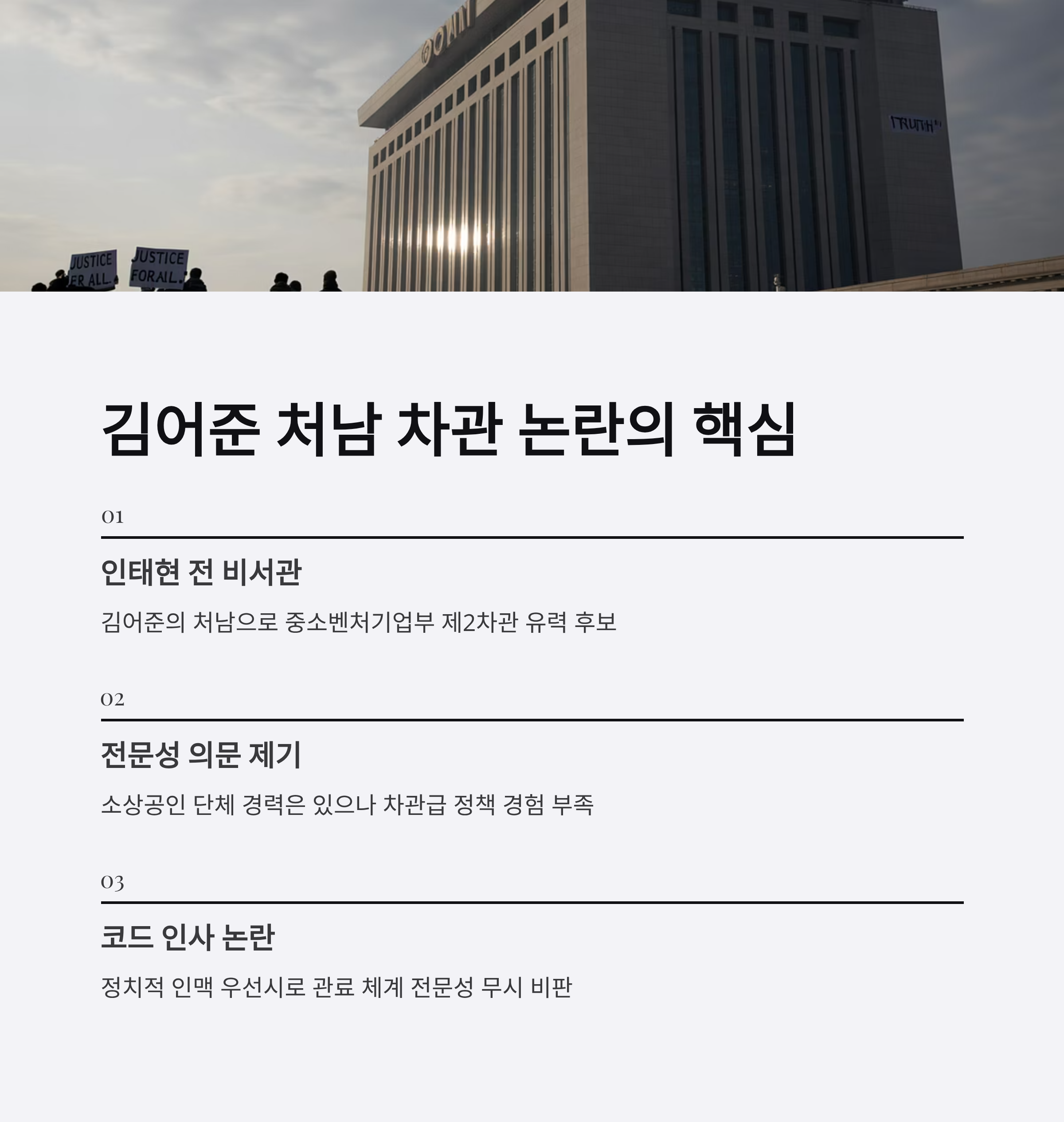 김어준의 처남 인태현 전 비서관이 중소벤처기업부 제2차관 후보로 거론되면서 이에 대한 비판이 거세지고 있습니다. 인태현 후보는 소상공인 단체 활동 경력을 가지고 있으나, 차관 직위에 필요한 전문성과 정책 경험에 대한 의문이 제기되고 있습니다. 이는 기존 관료 체계의 전문성을 무시하고 코드 인사로 정치적 논란을 자초한 것으로 보입니다.