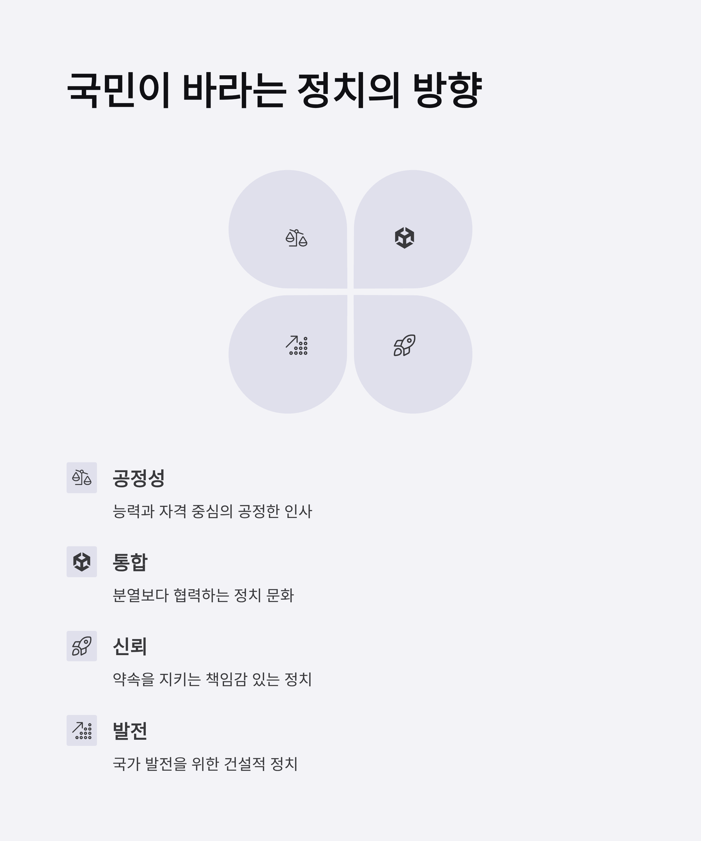 - 정치권의 신뢰 회복 위해, 정책 기반의 방향 전환 필요성 강조.