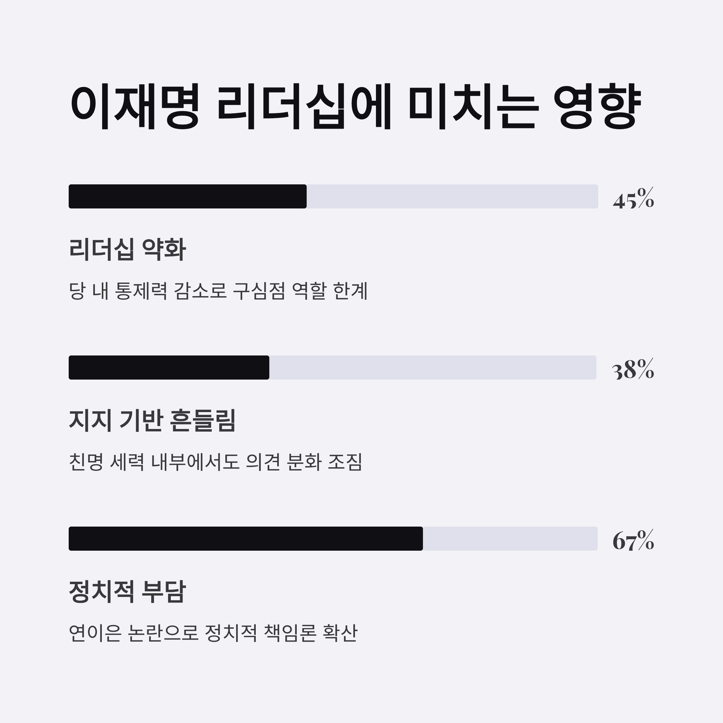 - 이재명 세력의 리더십 약화 조짐 보이며, 당 내 분열 심화 우려.