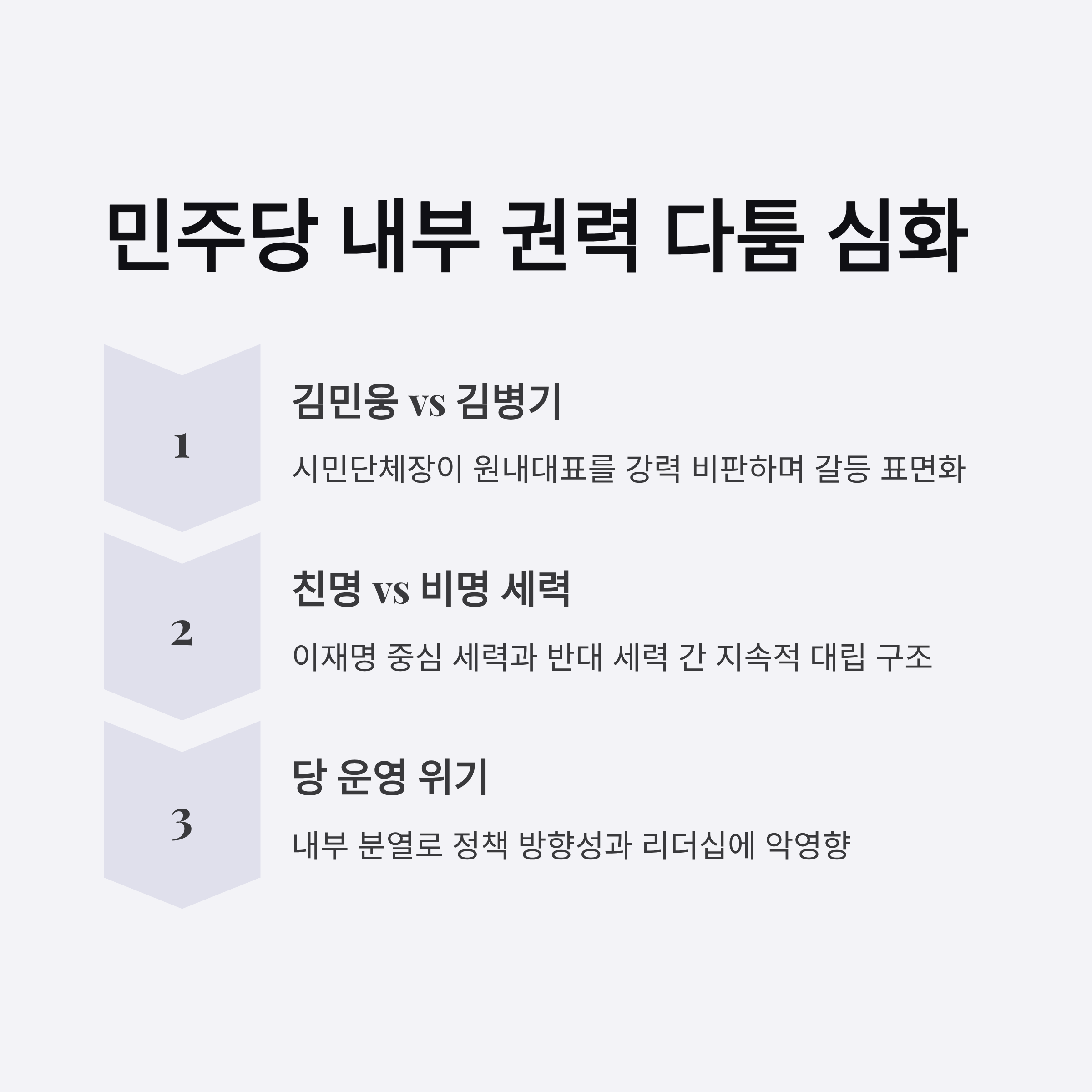 - 민주당 내부 친명파와 법민주파의 갈등, 김민웅-김병기 갈등으로 확대.