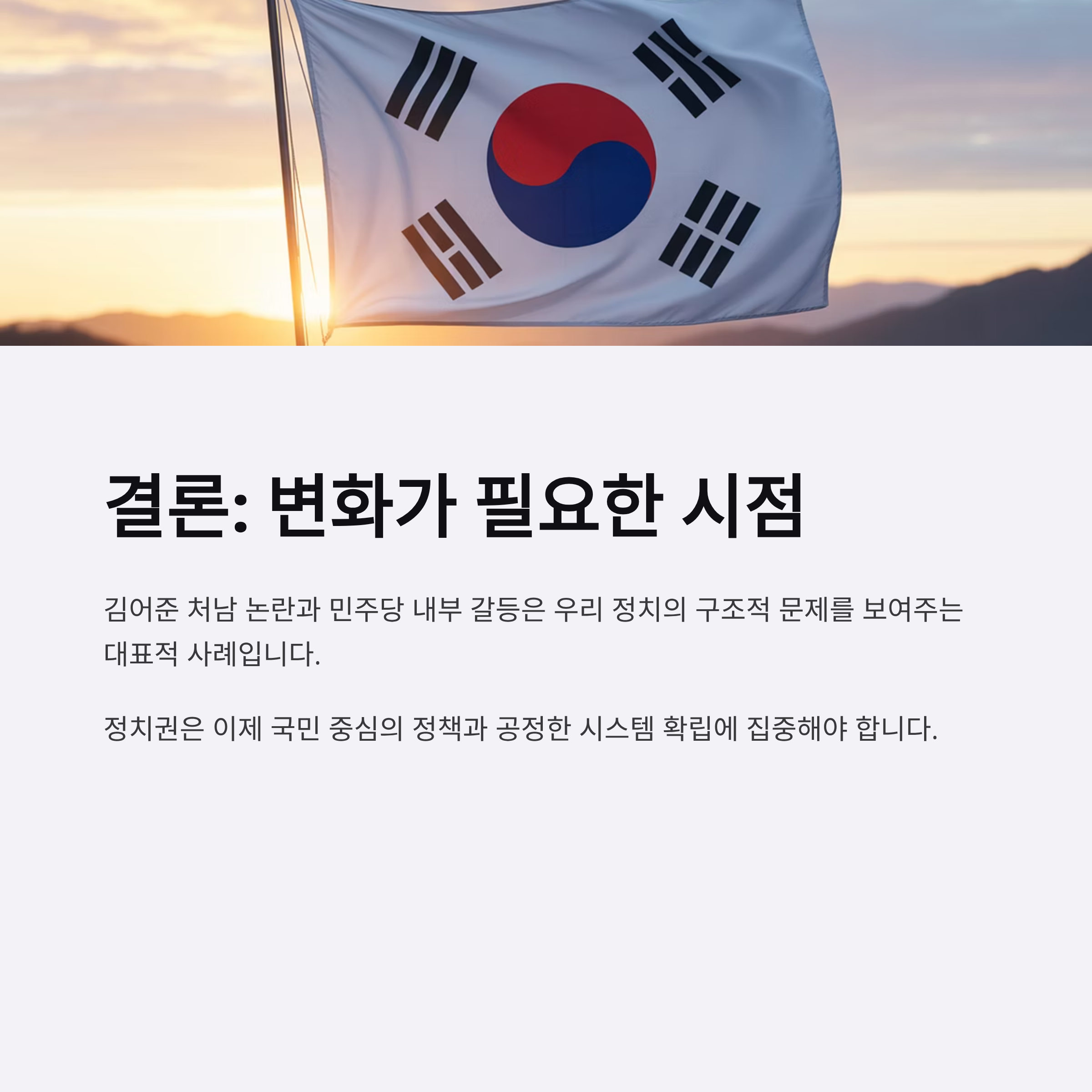 김어준 처남의 차관 논란과 민주당 내부 갈등은 모두 본질적으로 정책보다 세력 다툼에 초점이 맞춰져 있다는 공통점을 공유합니다. 이러한 정치는 국민들에게 실망을 안기며 정책의 신뢰도를 떨어뜨립니다. 정파 간 내부 충돌은 공정한 인사와 정책 추진을 어렵게 만들고, 국민의 목소리가 정치적 계산에서 뒤로 밀려남을 보여줍니다.