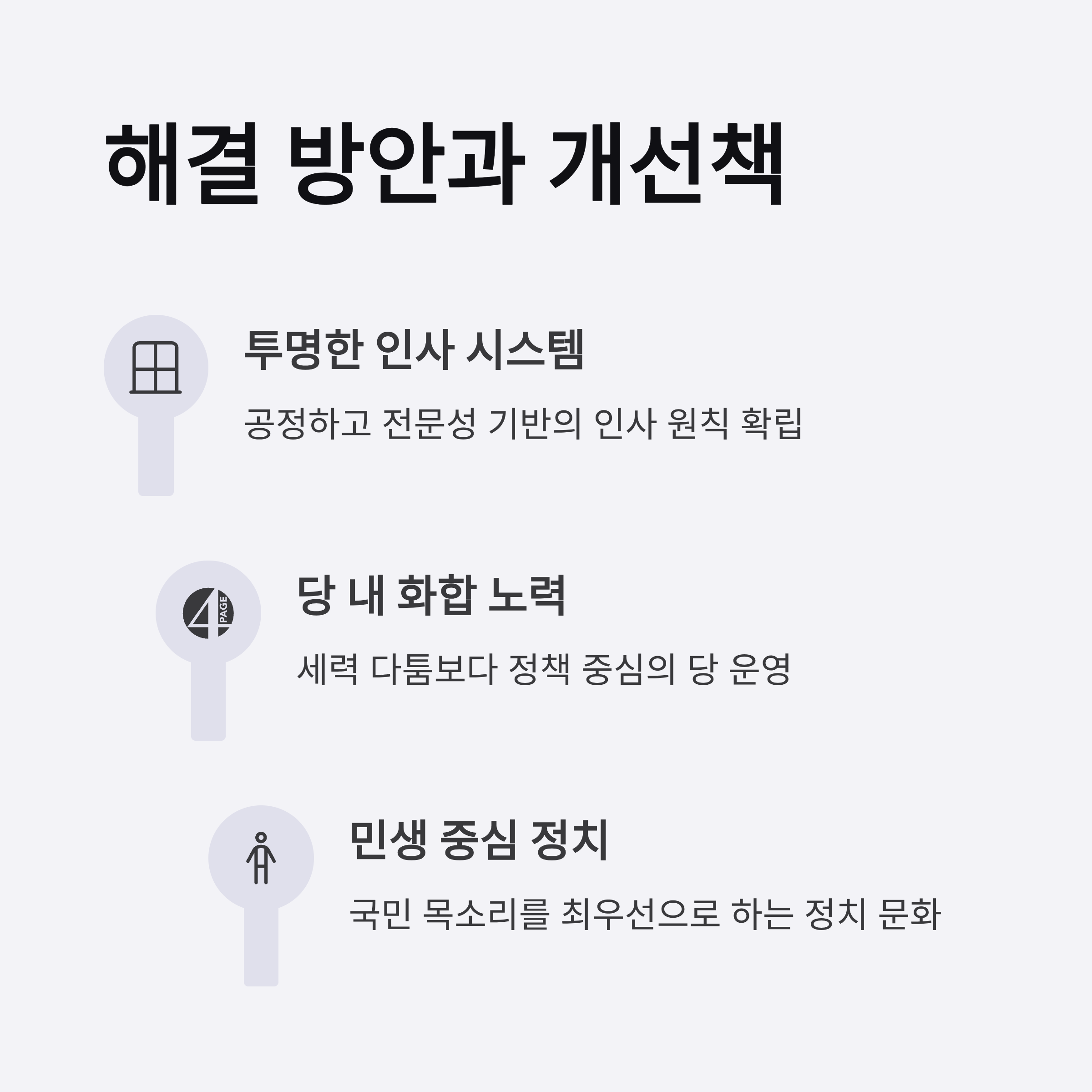 이러한 상황을 해결하려면 국민 중심의 정책과 공정한 시스템 확립이 필요합니다. 특히 정당 간, 당 내부의 대립이 아닌 협력과 신뢰를 기반으로 민생 문제를 해결하는 데 집중해야 합니다. 정치권이 국민의 목소리를 적극 반영하여 신뢰를 회복할 수 있는 길을 모색해야 할 시점입니다.